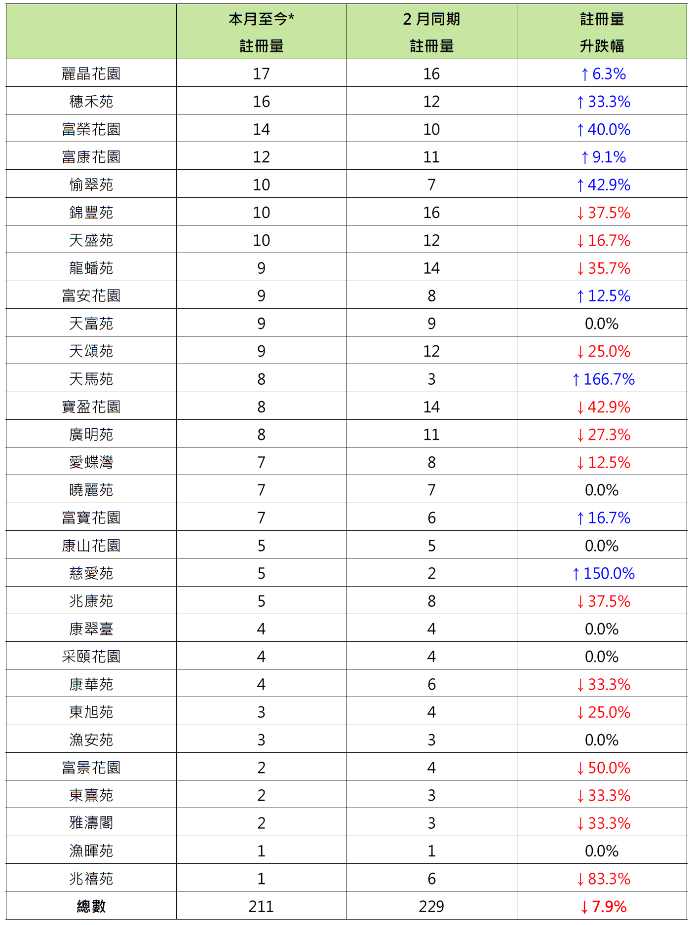 报跌屋苑中,屯门兆禧苑录1宗注册,较2月同期的6宗减少约83.3%;小西湾富景花园录2宗注册,较2月同期的4宗减少50%;将军澳宝盈花园录8宗注册,较2月同期的14宗减少约42.9%。