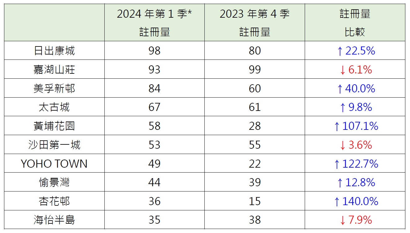 至于本季至今二手住宅注册量最多的10个屋苑中,已有7个屋苑二手住宅注册量超越上季全季水平;当中杏花邨录36宗注册,已较上季全季的15宗高出约1.4倍;YOHO TOWN(包括YOHO MIDTOWN)录49宗注册,已超上季全季的22宗逾1.2倍。