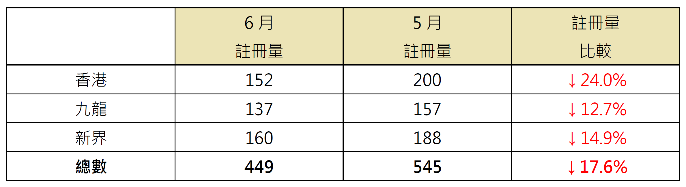 若以港岛、九龙及新界三区划分6月逾1,000万元二手住宅注册量表现,当中港岛区录152宗注册,较5月的200宗减少约24%;新界区录160宗注册,较5月的188宗减少约14.9%;九龙区录137宗注册,较5月的157宗减少约12.7%(见表)。
