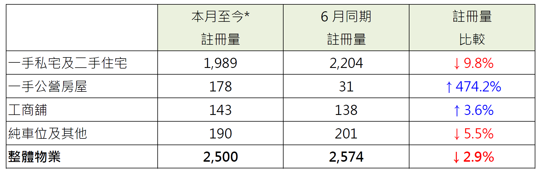 表︰本月至今*各类别物业注册量