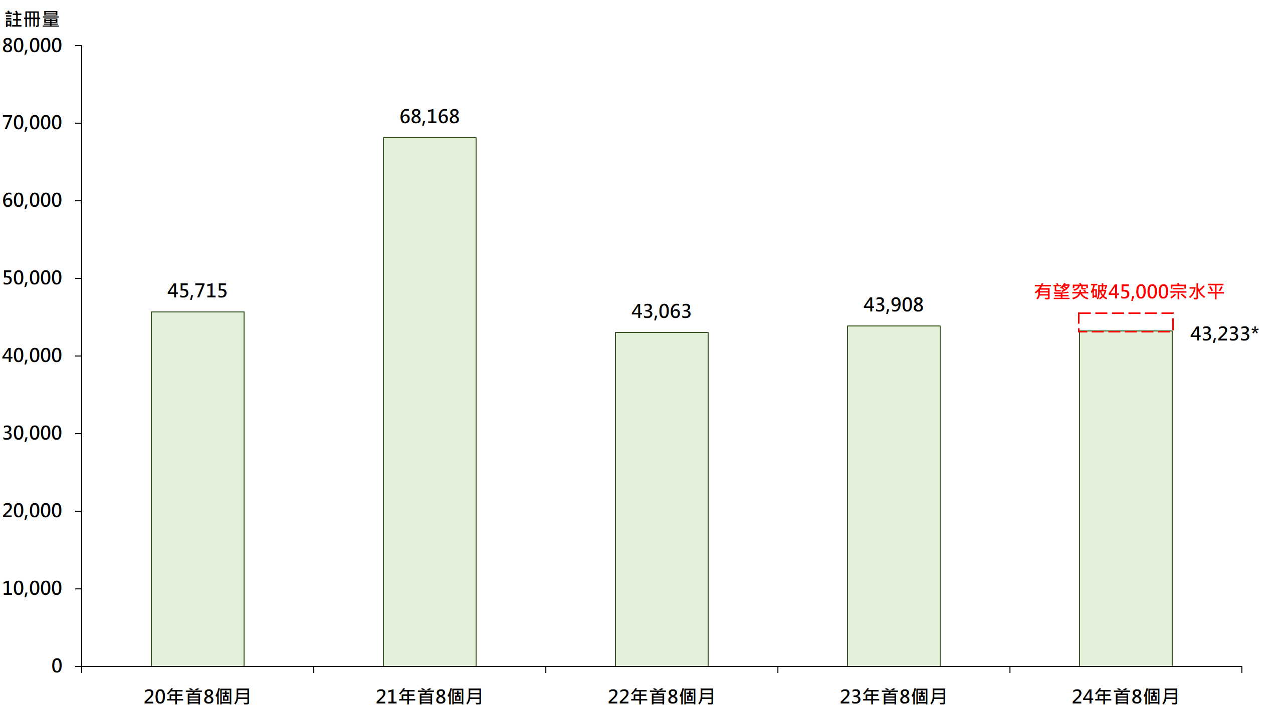 据土地注册处资料显示,本年至今(截至8月16日)整体物业(包括一手私宅及二手住宅、一手公营房屋、工商舖、纯车位及其他非住宅)录43,233宗注册,较去年同期的41,749宗增加约3.6%;若以目前注册进度推算,料今年首8个月注册量有望突破45,000宗水平,届时将创3年同期新高(见图)。
