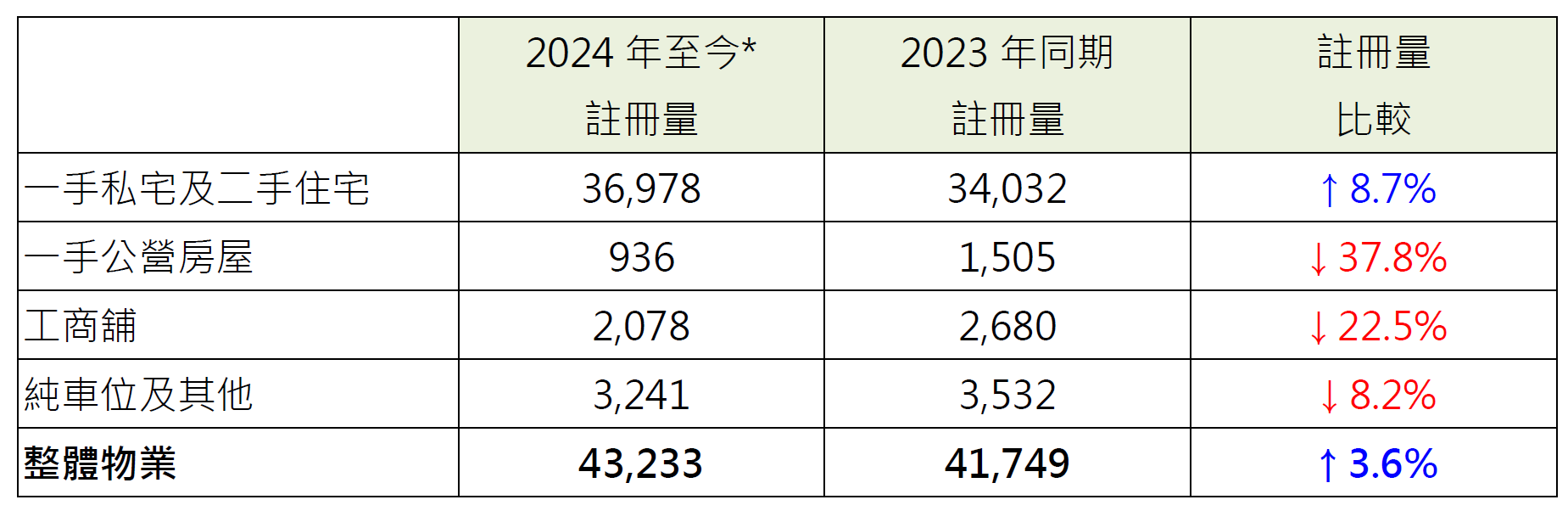 住宅物业方面,一手私宅及二手住宅本年至今录36,978宗注册,较去年同期的34,032宗增加约8.7%,带动整体物业注册量向上;相反,一手公营房屋本年至今录936宗注册,较去年同期的1,505宗减少约37.8%。
