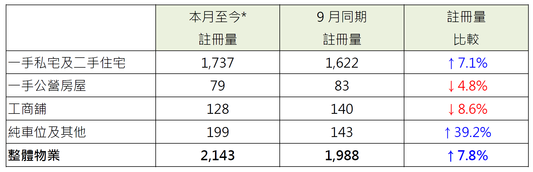 表︰本月至今*各类别物业注册量