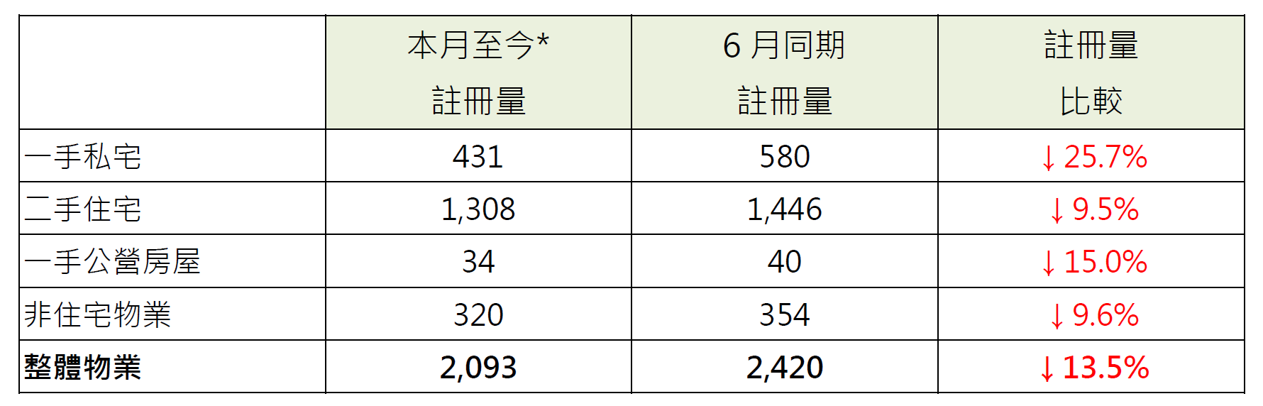 而一手公营房屋本月至今录34宗注册,较上月同期的40宗减少15%。非住宅物业本月至今录320宗注册,较上月同期的354宗减少约9.6%(见表)。