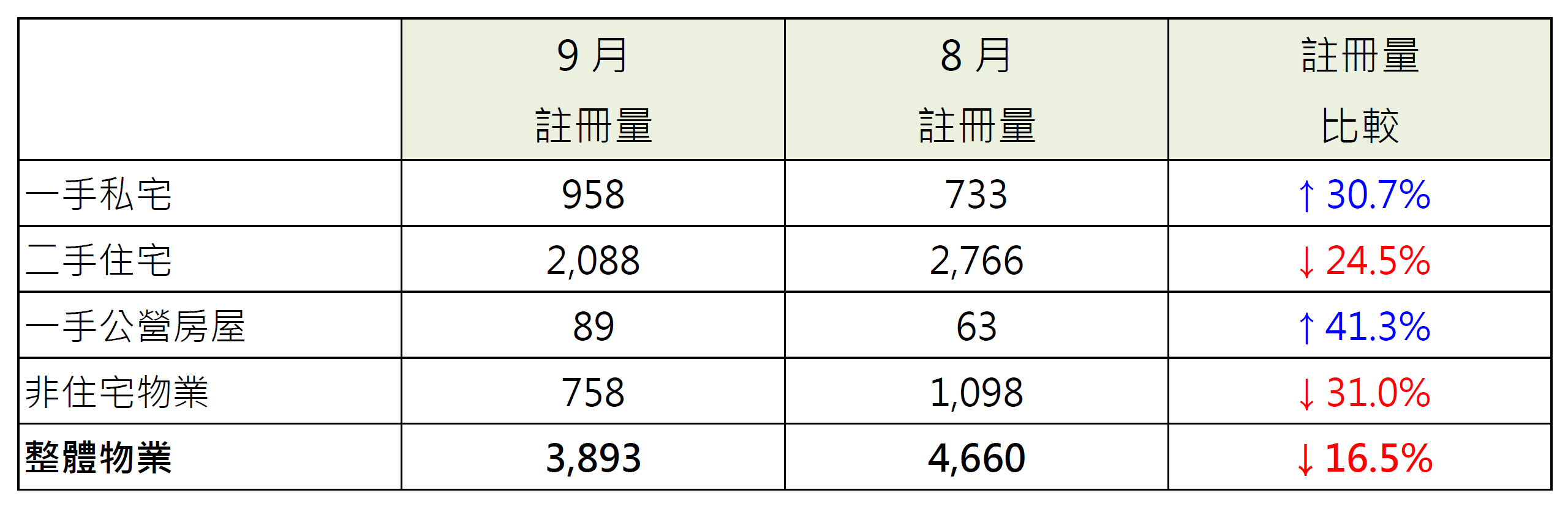 当中二手住宅9月录2,088宗注册,较8月的2,766宗减少约24.5%;非住宅物业9月录758宗注册,较8月的1,098宗减少约31%。