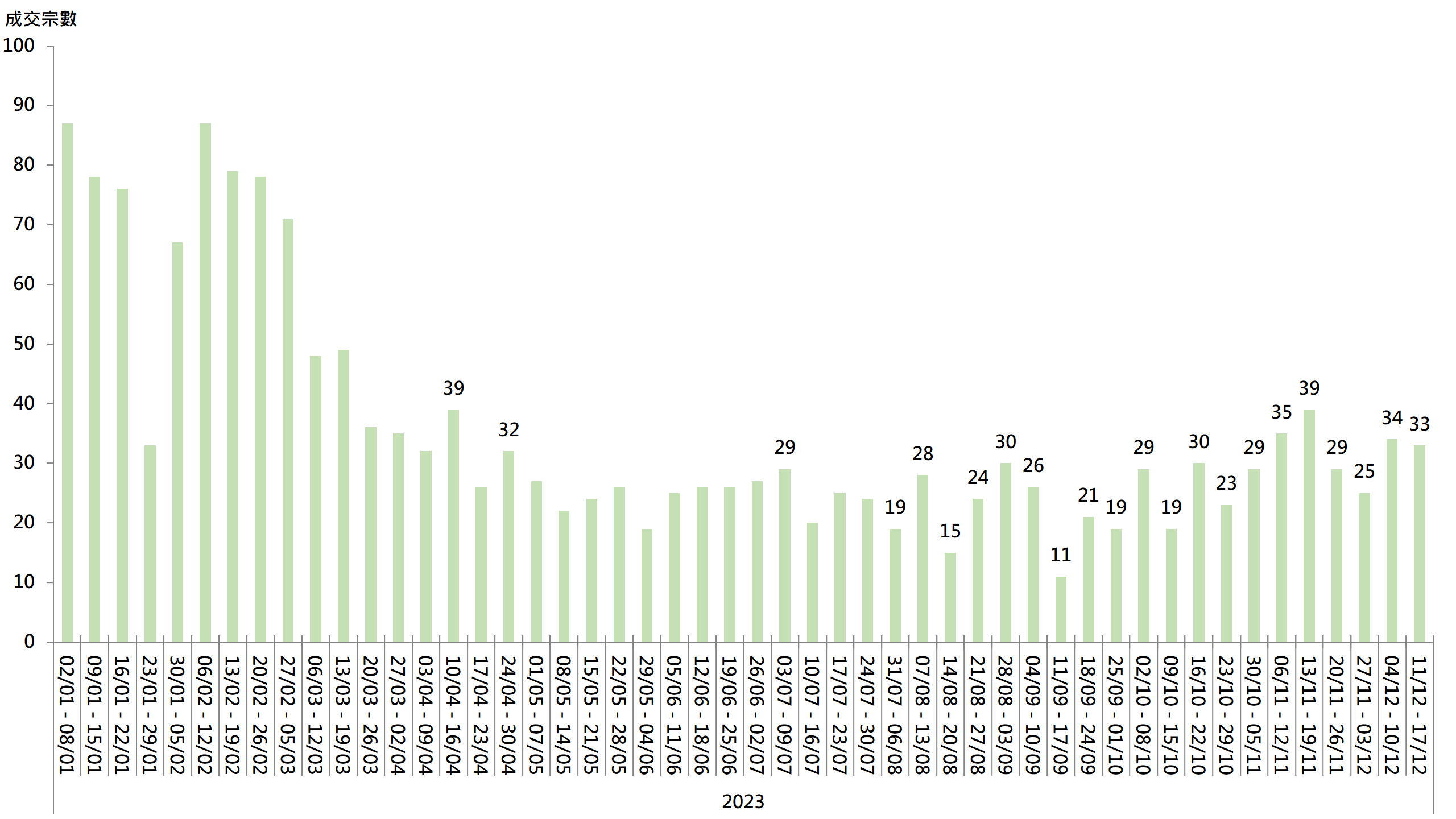图︰20大屋苑每周二手买卖成交宗数走势