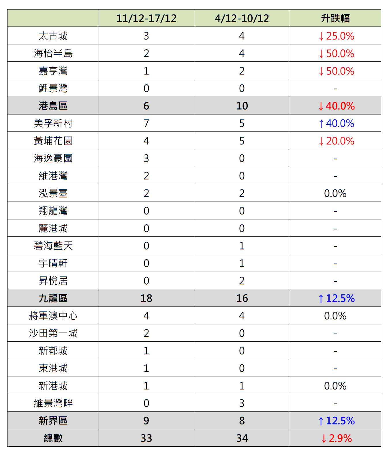 据本行前线分行所录得的数字显示,综合过去一星期(12月11日至12月17日)全港20大主要屋苑二手买卖录33宗成交,较前周(12月4日至12月10日)的34宗微跌1宗,或约2.9%(见图)。