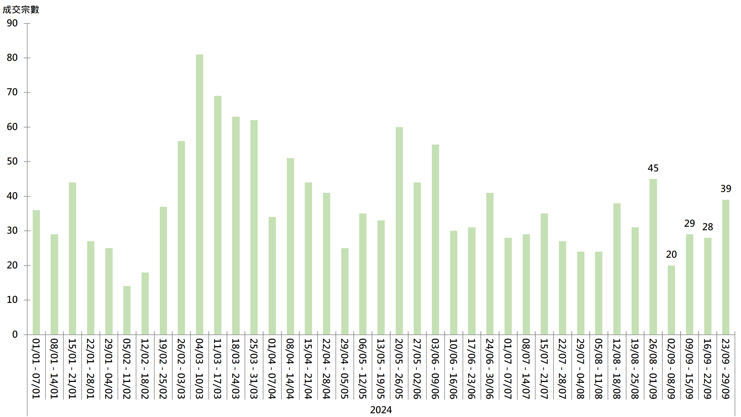 内地推出救市措施,带动本港股市连日造好,再加上香港减息,利好楼市气氛,上周新盘交投加快,20大主要屋苑交投表现亦不俗;据本行前线分行所录得的数字显示,综合过去一星期(9月23日至9月29日)全港20大主要屋苑二手买卖录39宗成交,较前周(9月16日至9月22日)的28宗增加约39.3%,创4周新高(见图)。