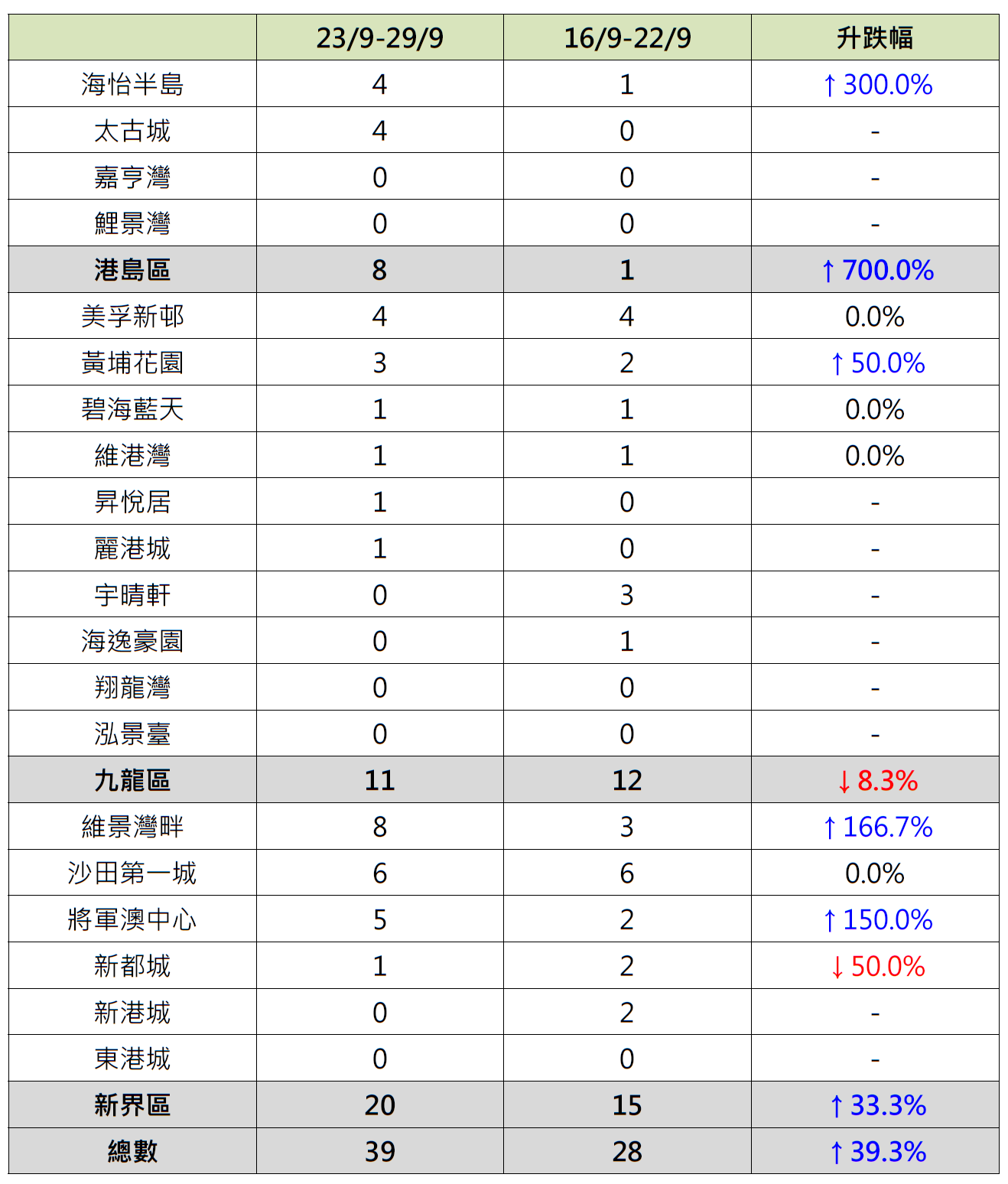 观乎上周港岛、九龙及新界三区屋苑二手交投按周表现,其中港岛区4个指标屋苑上周录8宗成交,较前周的1宗大增7倍;当中海怡半岛录4宗成交,较前周的1宗大增3倍;太古城“破蛋”,按周增加4宗成交。