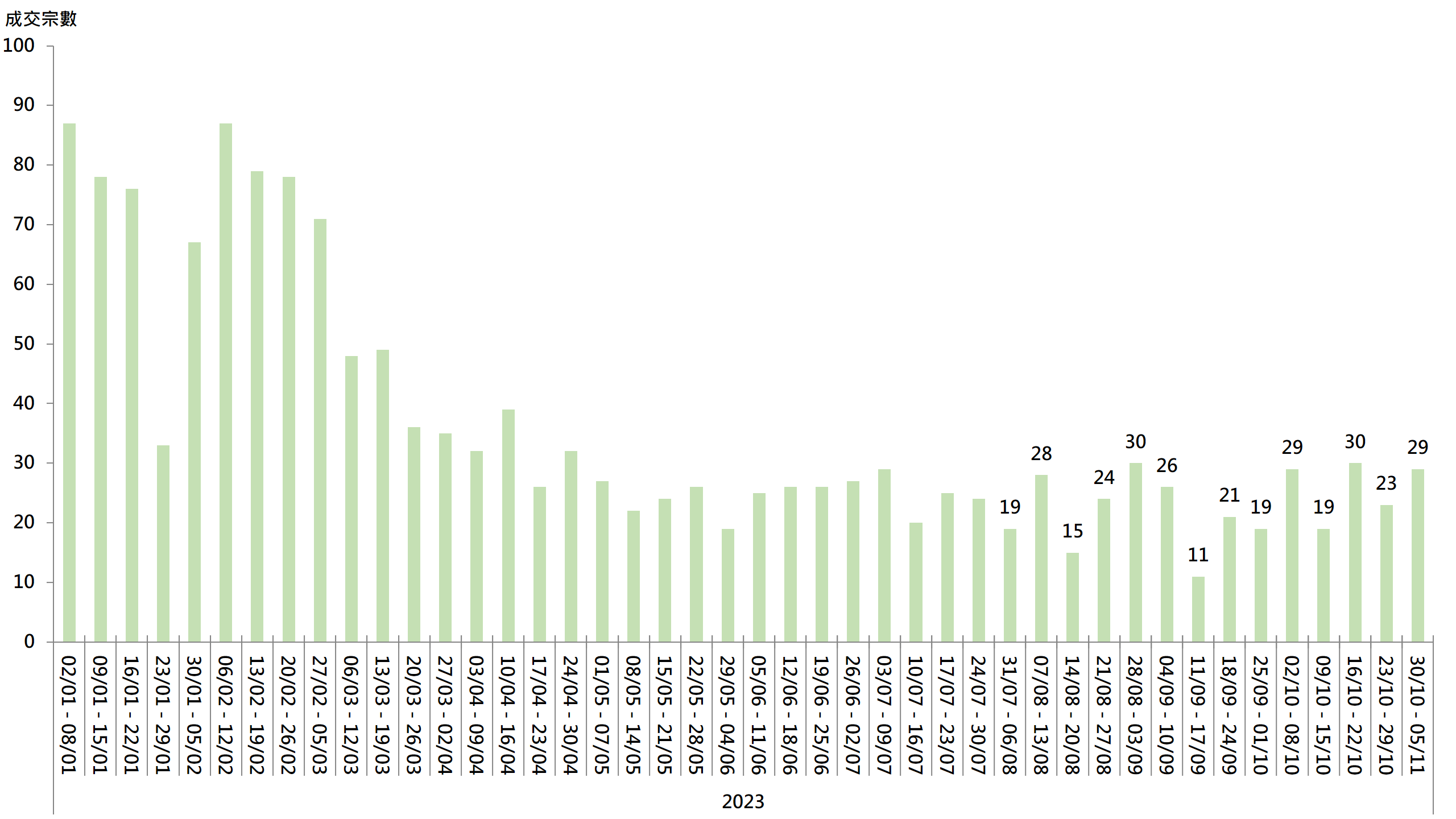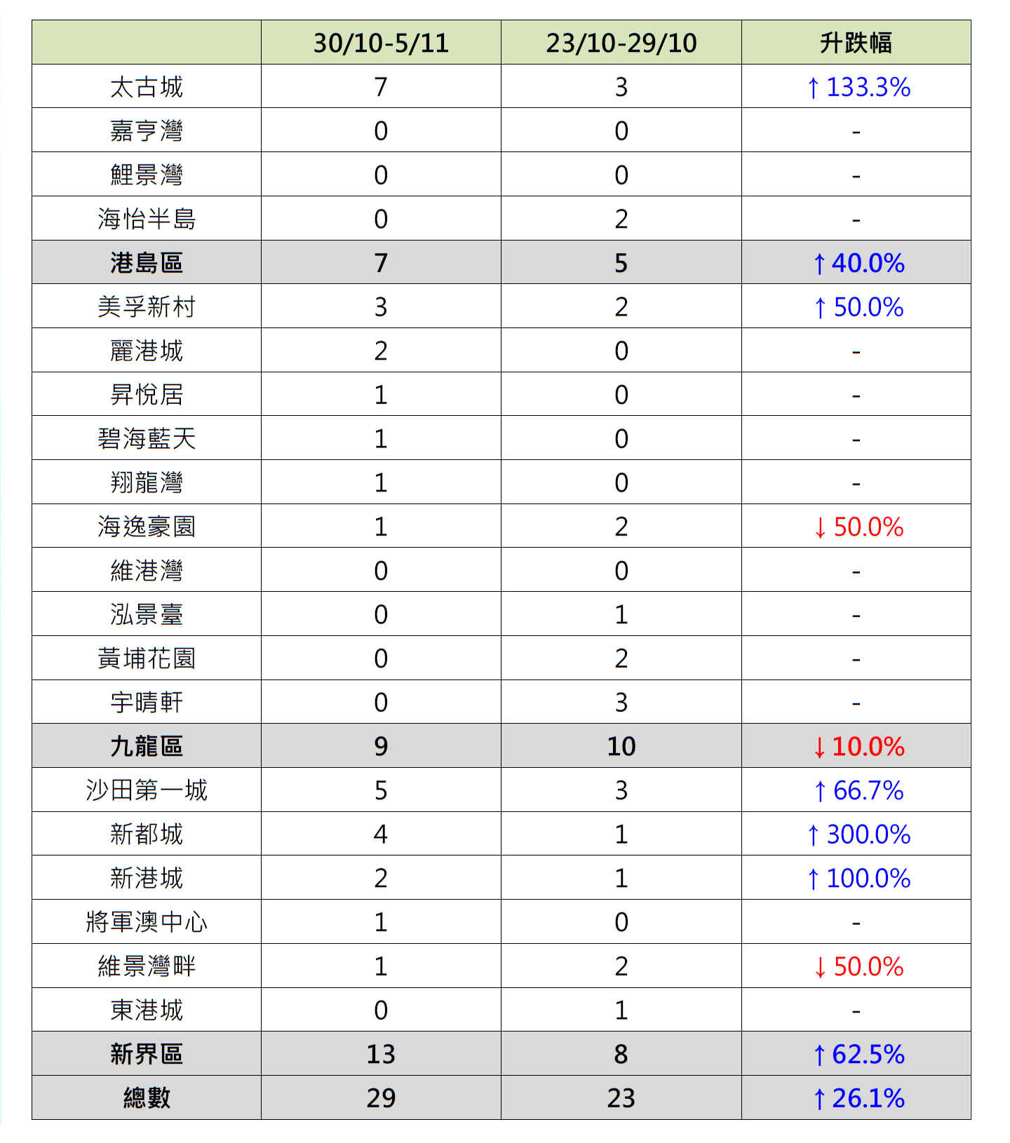 受惠于《施政报告》推出减辣措施,加上美国暂停加息,上周二手交投回升;据本行前线分行所录得的数字显示,综合过去一星期(10月30日至11月5日)全港20大主要屋苑二手买卖录29宗成交,较前周(10月23日至10月29日)的23宗增加约26.1%(见图)。