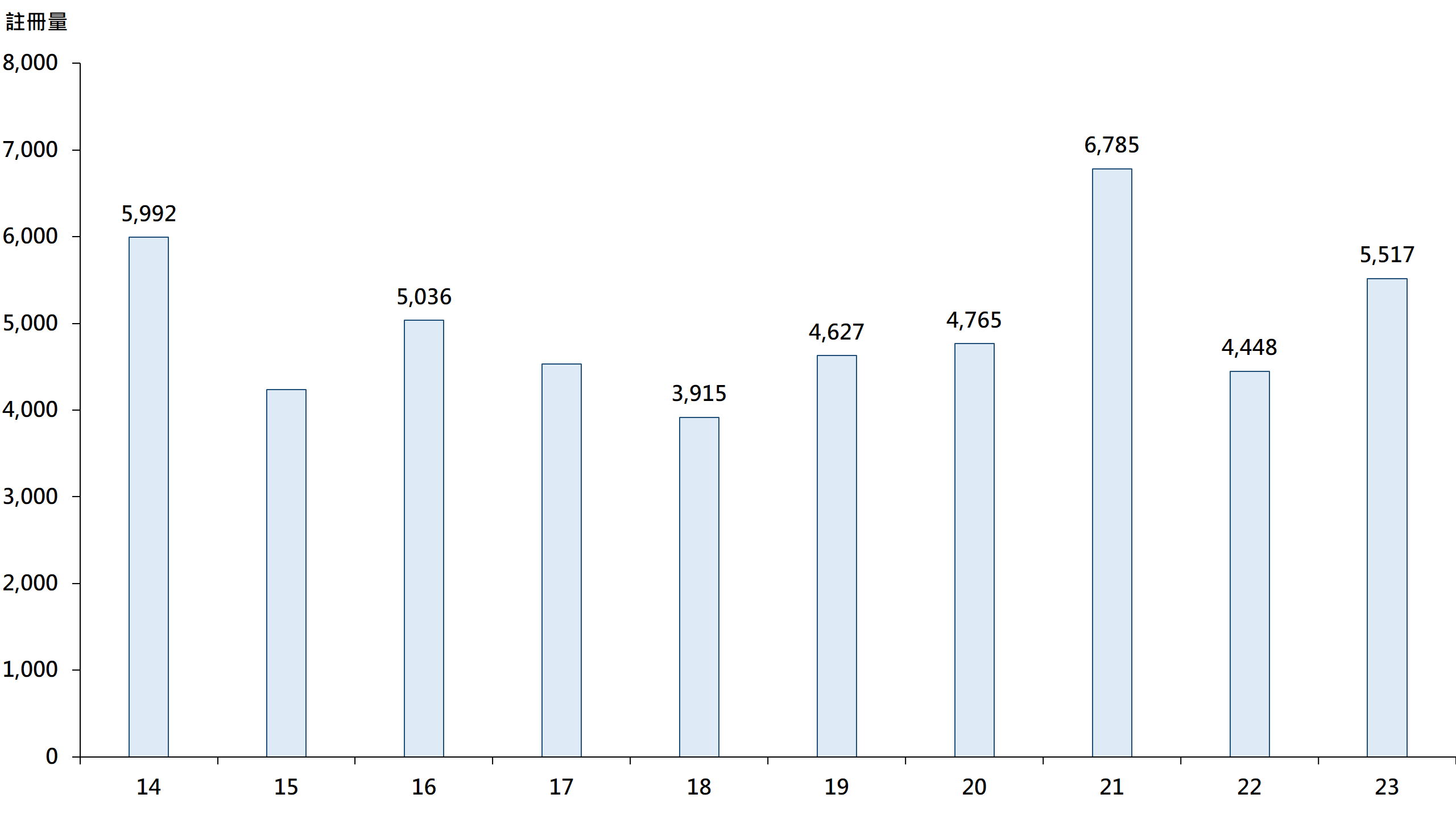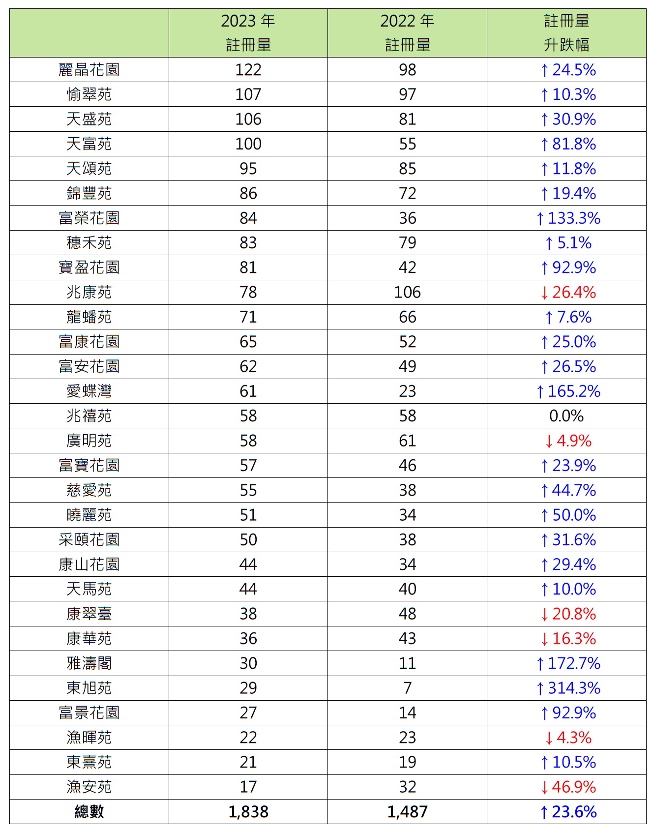注册量按年报升的屋苑中,筲箕湾东旭苑录29宗注册,较22年的7宗增加逾3.1倍;黄竹坑雅涛阁录30宗注册,较22年的11宗增加逾1.7倍;筲箕湾爱蝶湾录61宗注册,较22年的23宗增加逾1.6倍。