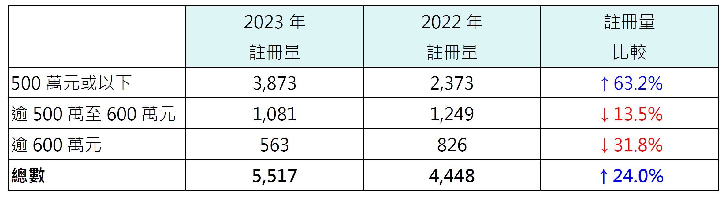 若以金额划分去年二手居屋注册量表现,其中500万元或以下二手居屋录3,873宗注册,较22年的2,373宗增加约63.2%;相反,逾500万至600万元二手居屋录1,081宗注册,较22年的1,249宗减少约13.5%;逾600万元二手居屋录563宗注册,较22年的826宗减少约31.8%(见表一)。