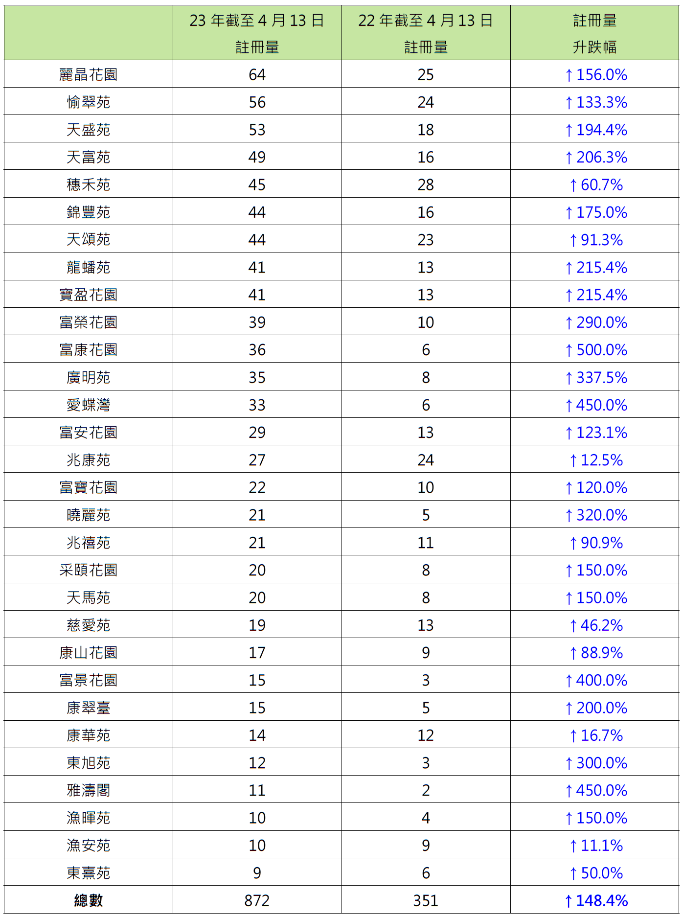 白居二带动下,二手居屋(包括已补地价的自由市场及未补地价的第二市场)本年至今(截至4月13日)录2,431宗注册,较去年同期的1,085宗增加逾1.2倍。