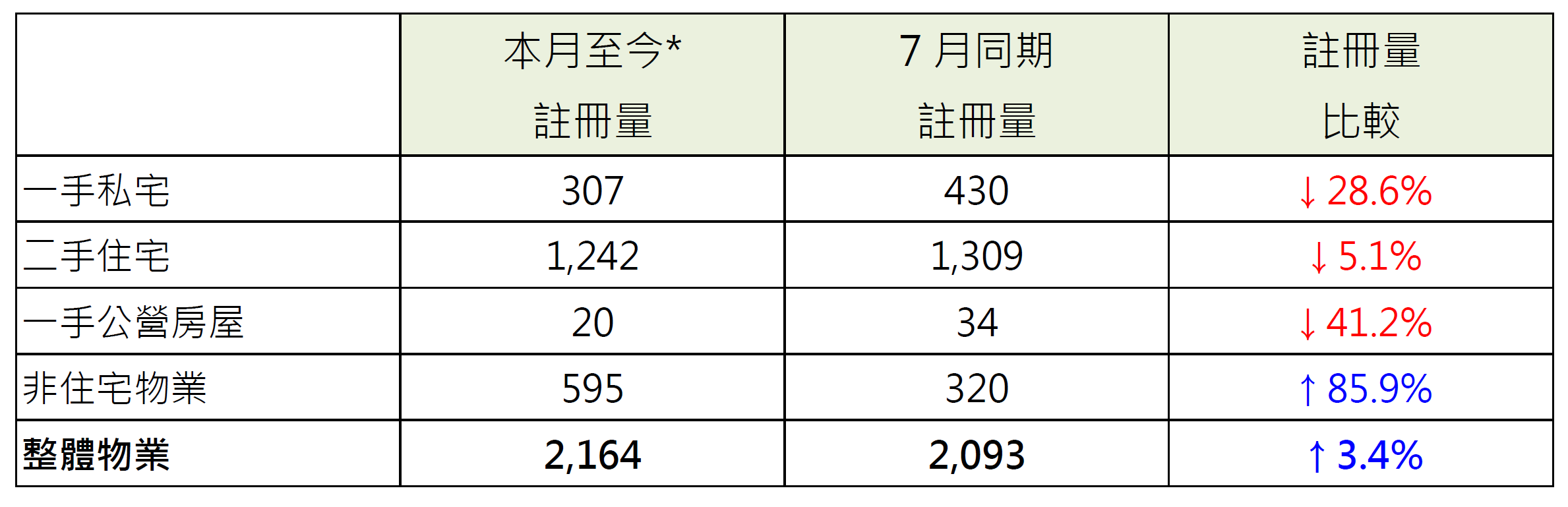 表︰本月至今*各类别物业注册量
