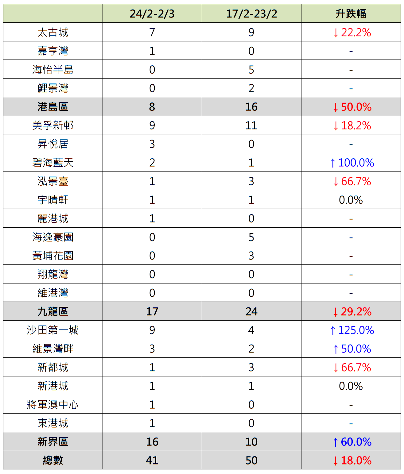 观乎上周港岛、九龙及新界三区屋苑二手交投按周表现,其中港岛区4个指标屋苑上周录8宗成交,较前周的16宗减少50%;当中太古城录7宗成交,较前周的9宗减少约22.2%;鲤景湾由前周录2宗成交减少至上周“零成交”;海怡半岛更由前周录5宗成交减少至上周“零成交”;相反,嘉亨湾“破蛋”,按周增加1宗成交。