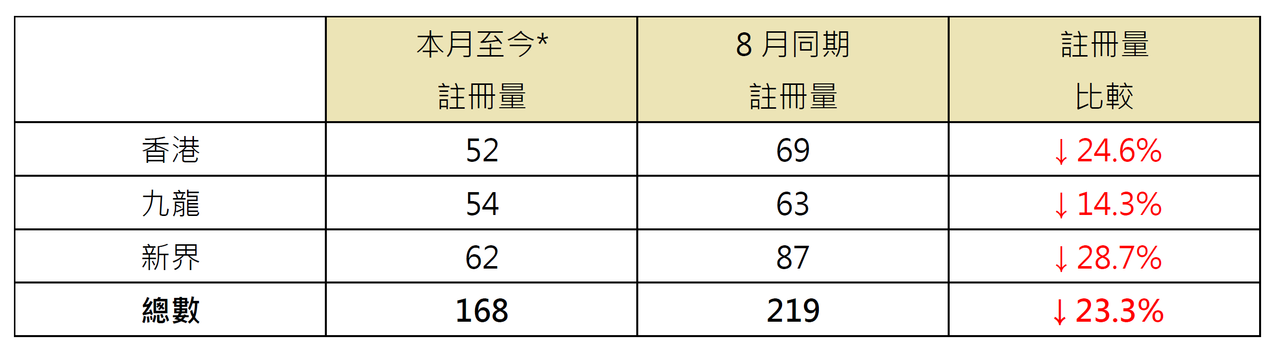 若以港岛、九龙及新界三区划分本月至今逾1,000万元二手住宅注册量表现,当中九龙区录54宗注册,较8月同期的63宗减少约14.3%;港岛区录52宗注册,较8月同期的69宗减少约24.6%;新界区录62宗注册,较8月同期的87宗减少约28.7%(见表)。