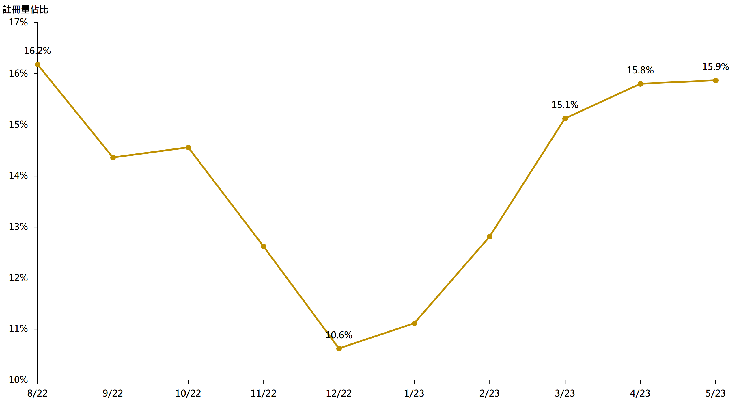 由于5月逾1,000万元二手住宅注册量按月表现较佳,因此其占整体二手住宅注册量比率由4月约15.8%,增加至5月约15.9%,连升5个月,创9个月新高(见图)。鉴于签署买卖合约至递交到土地注册处注册登记需时,5月注册个案一般主要反映4月市况。