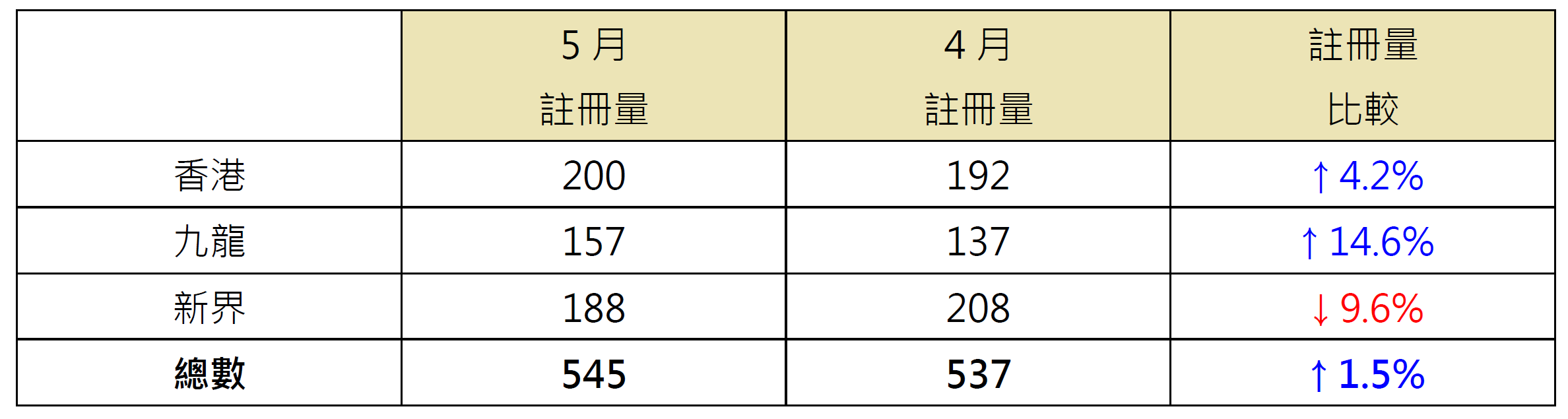 若以港岛、九龙及新界三区划分5月逾1,000万元二手住宅注册量表现,当中港岛区录200宗注册,较4月的192宗增加约4.2%;九龙区录157宗注册,较4月的137宗增加约14.6%;相反,新界区录188宗注册,较4月的208宗减少约9.6%(见表)。