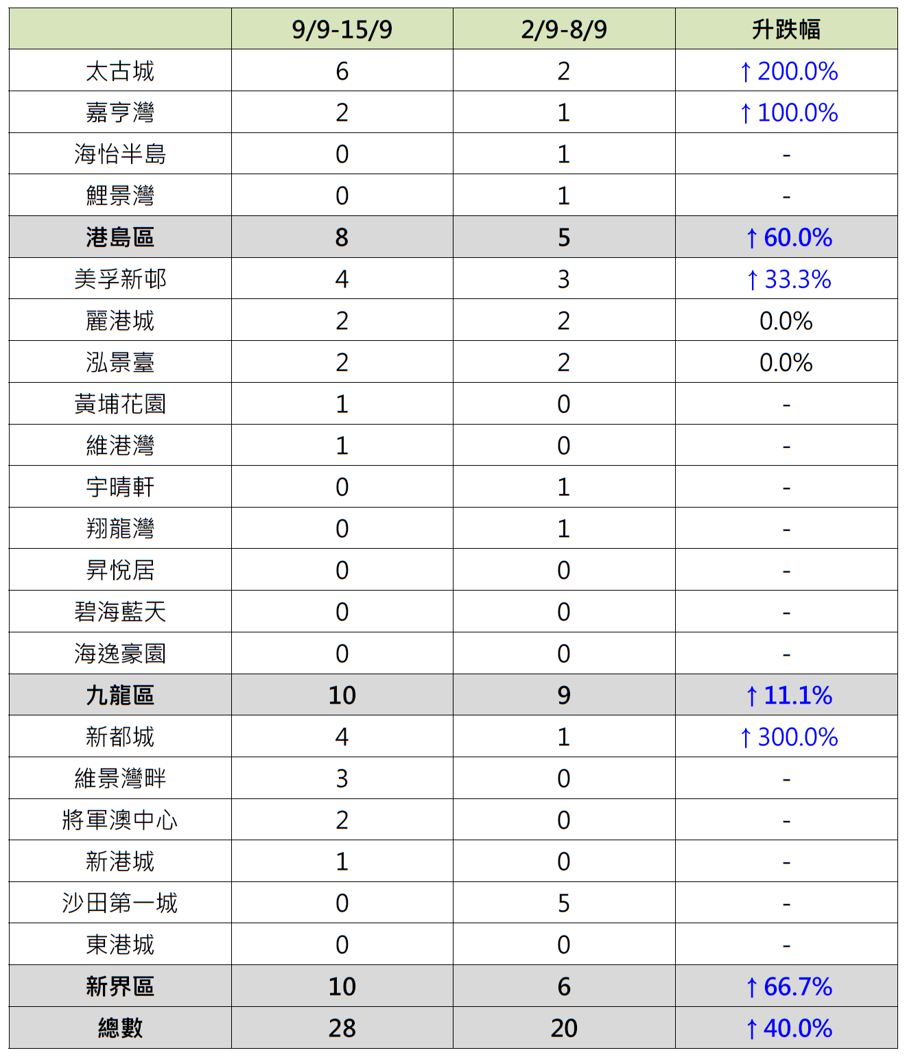 港岛区4个指标屋苑上周录8宗成交,较前周的5宗增加60%;当中嘉亨湾录2宗成交,较前周的1宗大增1倍;太古城录6宗成交,较前周的2宗更大增2倍;相反,海怡半岛及鲤景湾齐由前周录1宗成交减少至上周“零成交”。