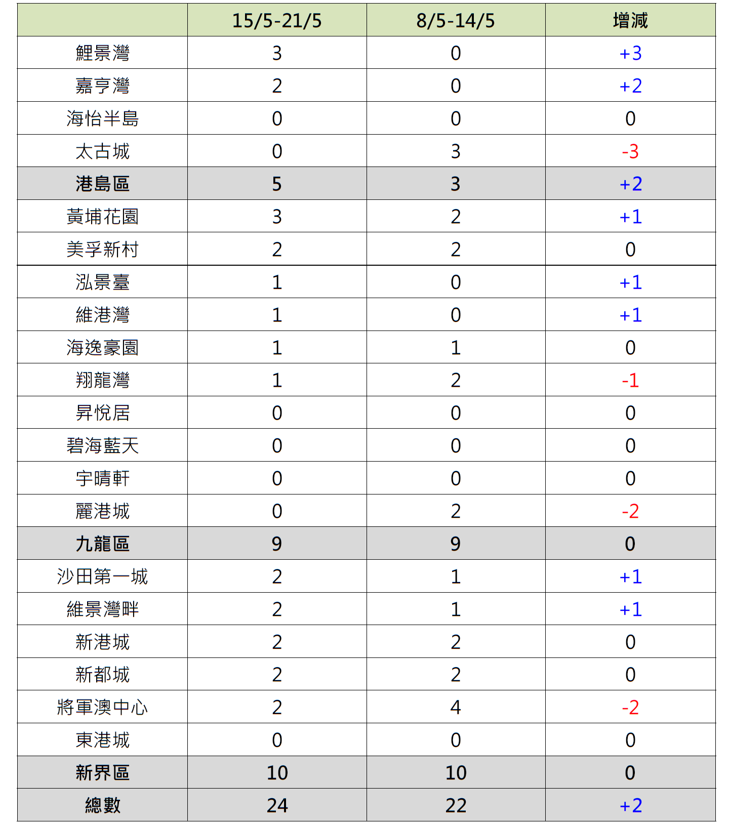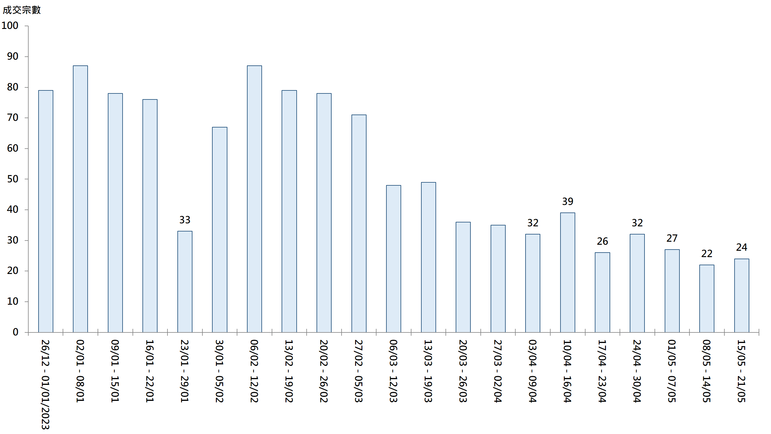 近期新盘推售不断,抢去市场购买力,二手交投持续受压。据本行前线分行所录得的数字显示,综合过去一星期(5月15日至5月21日)全港20大主要屋苑二手买卖录24宗成交,较前周(5月8日至5月14日)的22宗微增2宗,连续3周录不足30宗(见图)。