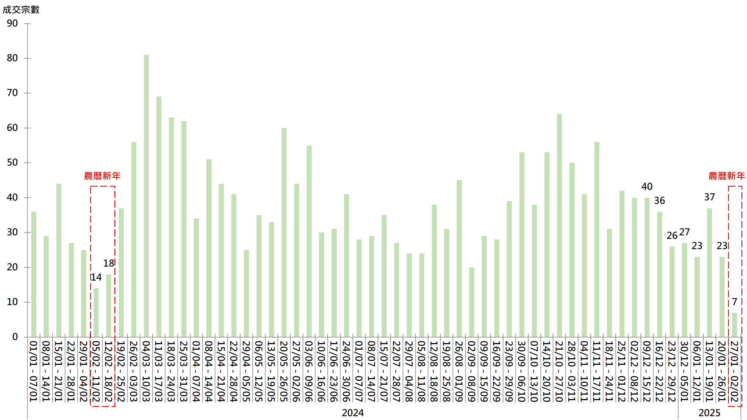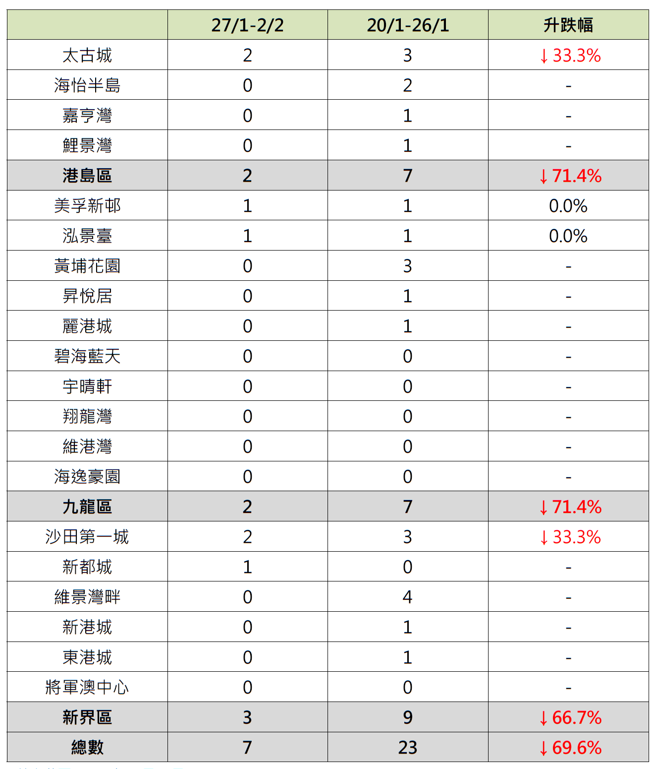 农历新年向来是传统二手淡季,再加上今年春节假期紧接周末,不少市民趁长假外游,春节假期二手屋苑成交淡静。据本行前线分行所录得的数字显示,综合过去一星期(1月27日至2月2日)全港20大主要屋苑二手买卖仅录得7宗成交,较前周(1月20日至1月26日)的23宗大跌约69.6%(见图);相信农历新年后,节日因素淡化,二手交投有望回升。