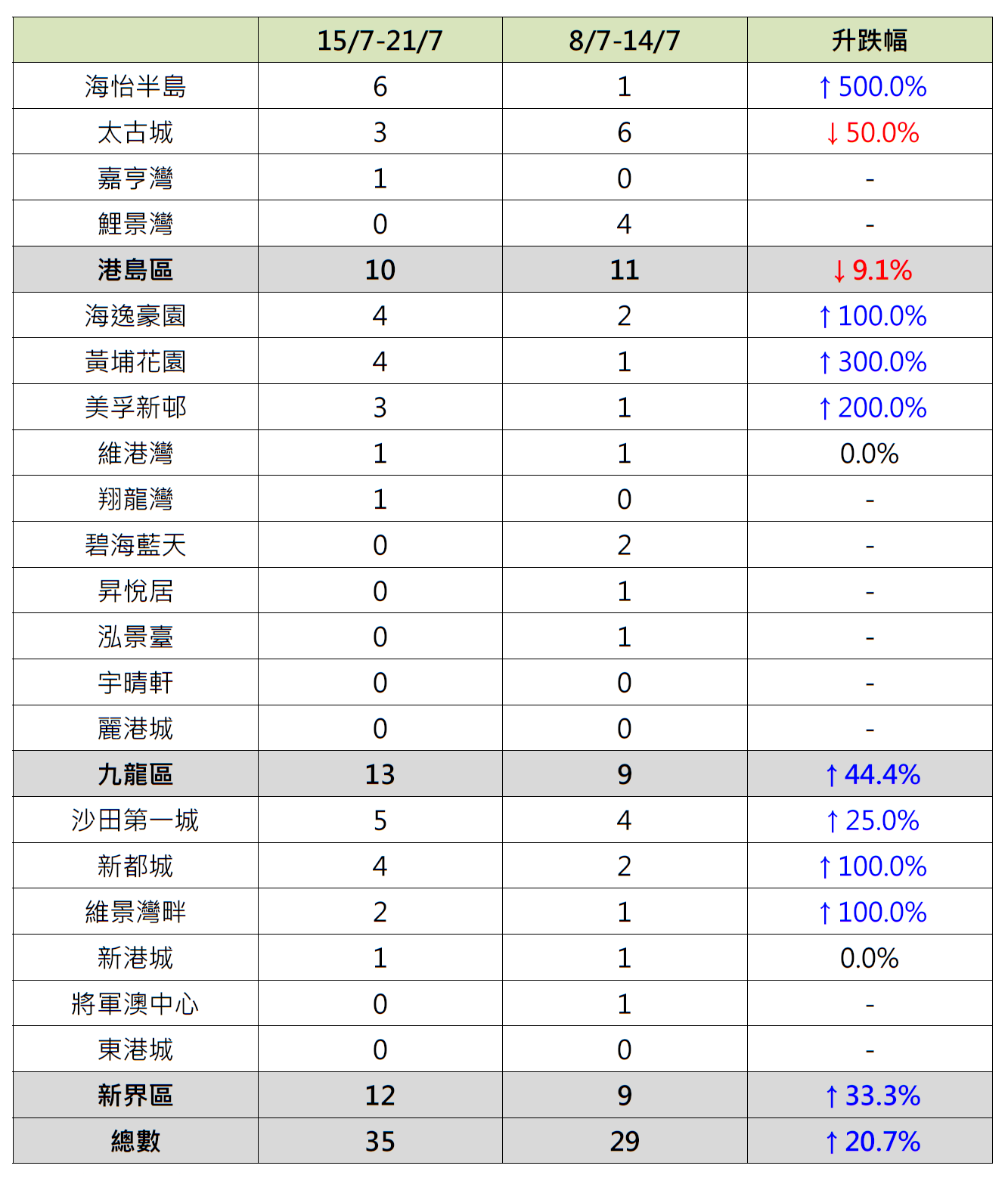 据本行前线分行所录得的数字显示,综合过去一星期(7月15日至7月21日)全港20大主要屋苑二手买卖录35宗成交,较前周(7月8日至7月14日)的29宗增加约20.7%(见图)。