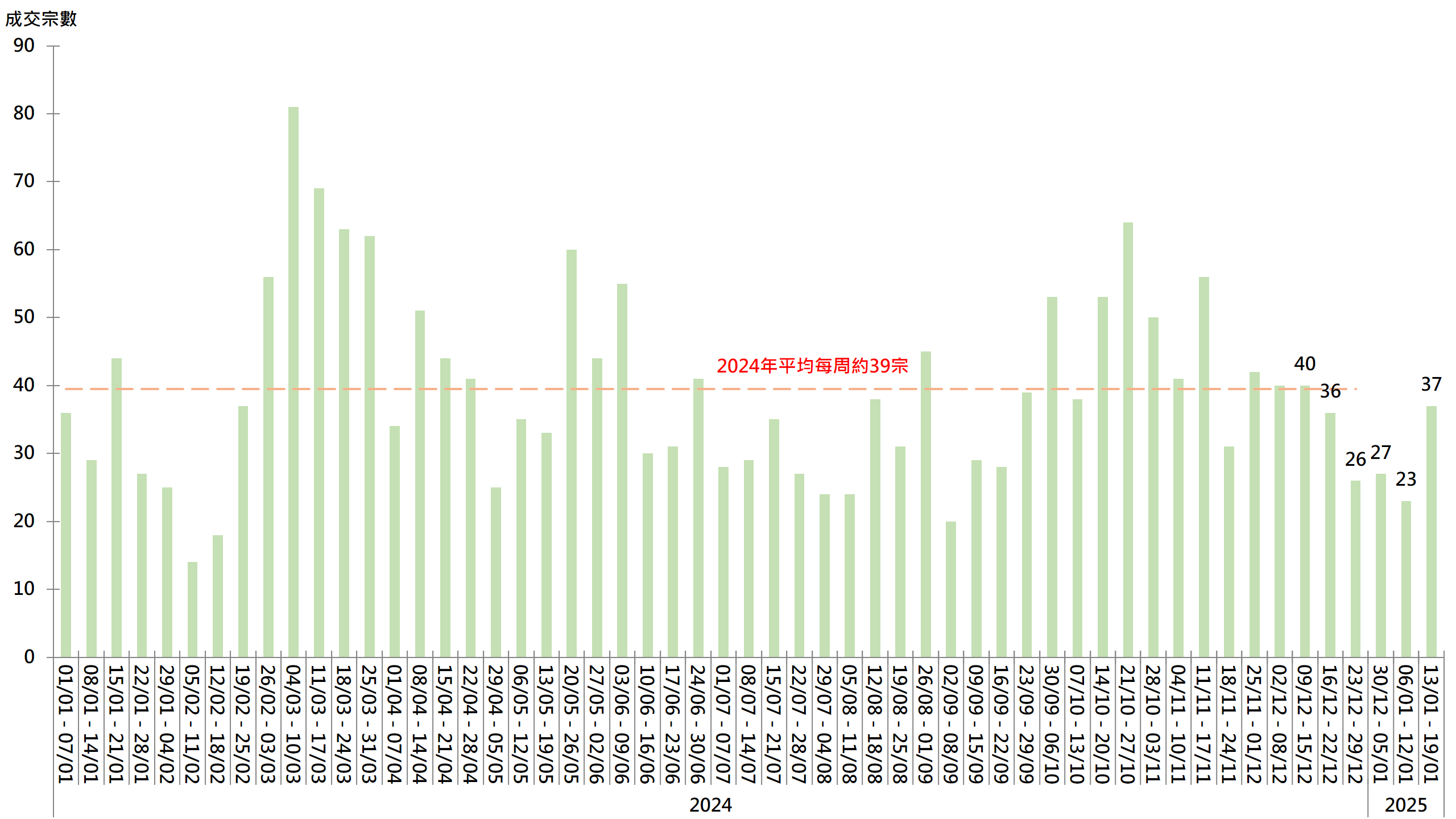 据本行前线分行所录得的数字显示,综合过去一星期(1月13日至1月19日)全港20大主要屋苑二手买卖录37宗成交,较前周(1月6日至1月12日)的23宗增加约60.9%;成交按周“显著”上升,主要因前一周“基数低”所致;事实上,上周成交宗数与2024年平均每周约39宗相若,可见上周成交宗数水平未算突出(见图)。