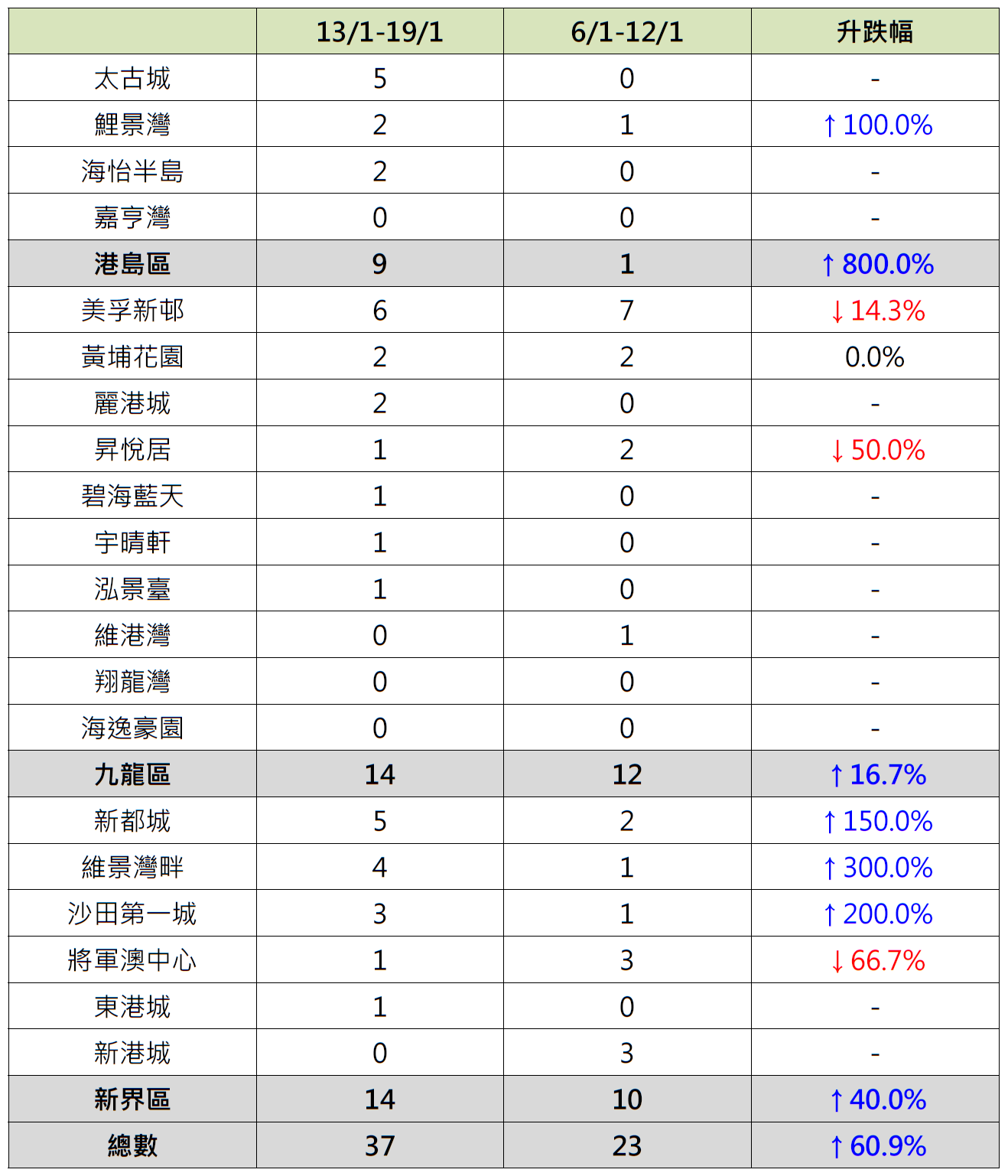 新界区6个指标屋苑上周录14宗成交,较前周的10宗增加40%;当中新都城录5宗成交,较前周的2宗增加1.5倍;沙田第一城录3宗成交,较前周的1宗增加2倍;维景湾畔录4宗成交,较前周的1宗增加3倍;东港城“破蛋”,按周增加1宗成交;相反,将军澳中心录1宗成交,较前周的3宗减少约66.7%;新港城更由前周录3宗成交减少至上周“零成交”。