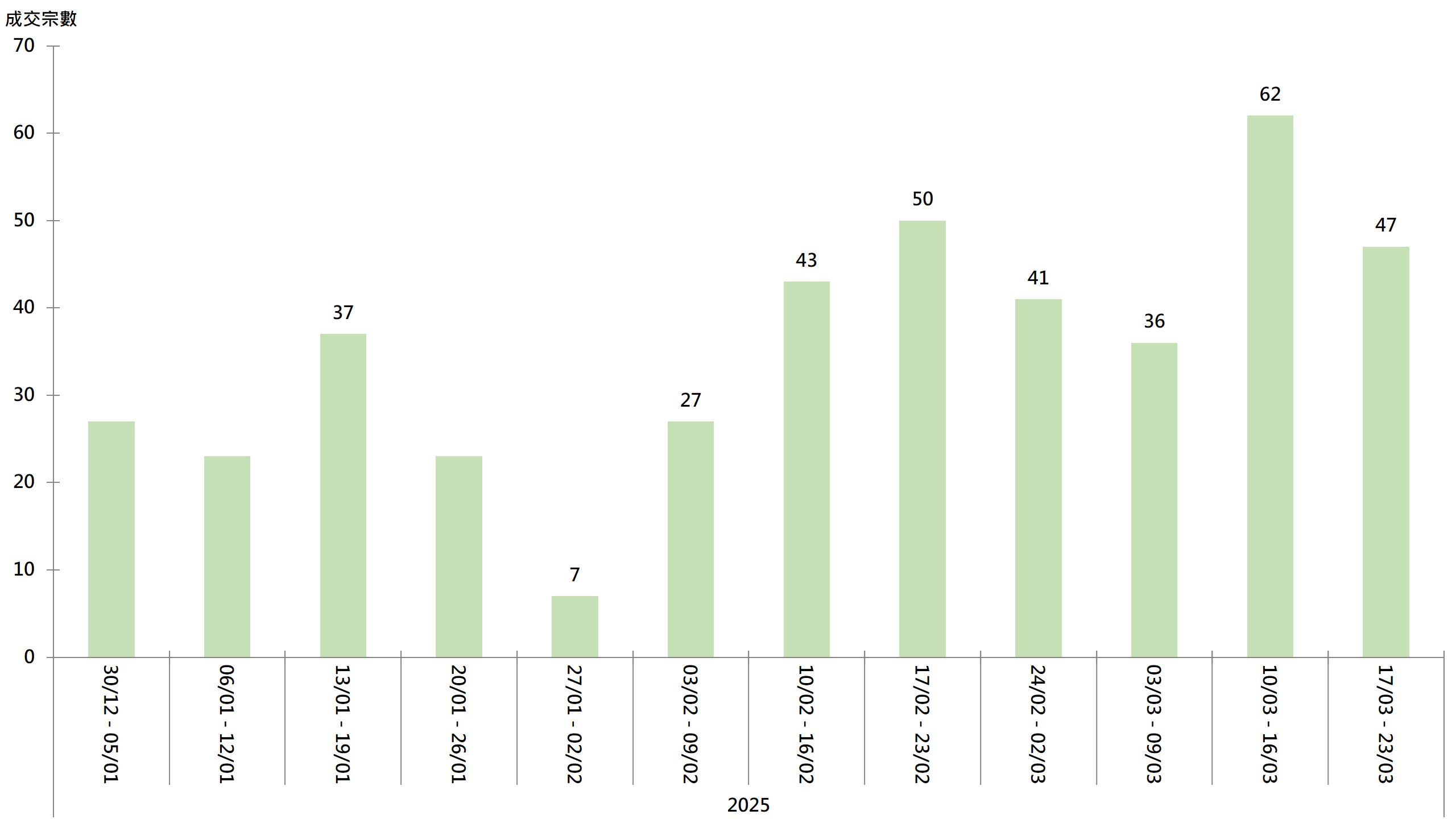据本行前线分行所录得的数字显示,综合过去一星期(3月17日至3月23日)全港20大主要屋苑二手买卖录47宗成交,虽较前周(3月10日至3月16日)的62宗减少约24.2%,但仍属本年至今第三高(见图)。