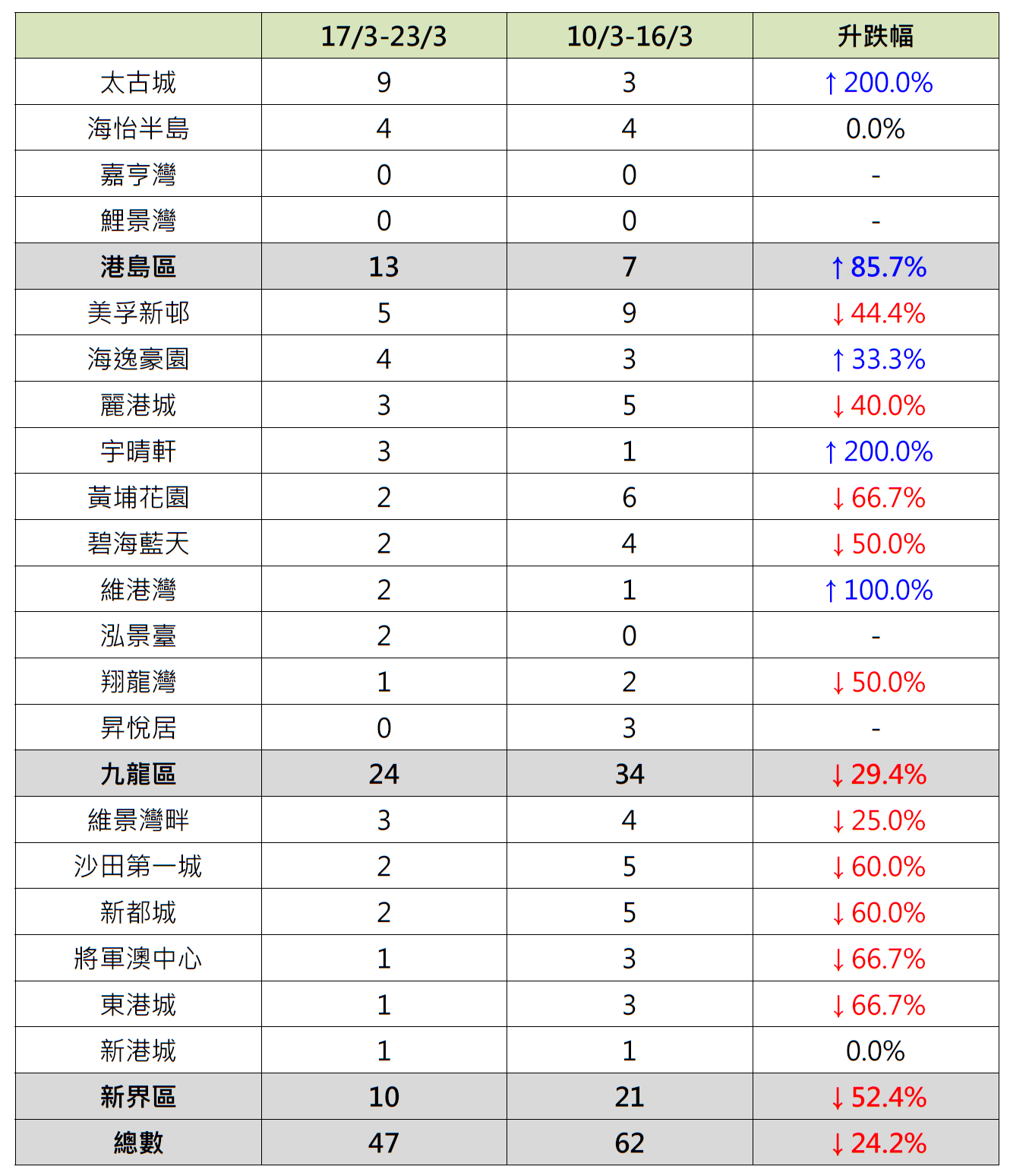 反观,港岛区4个指标屋苑上周录13宗成交,较前周的7宗增加约85.7%;当中太古城录9宗成交,较前周的3宗增加2倍,带动港岛区4个指标屋苑成交按周录升;海怡半岛录4宗成交,按周持平;嘉亨湾及鲤景湾上周与前周一样未录得任何成交。