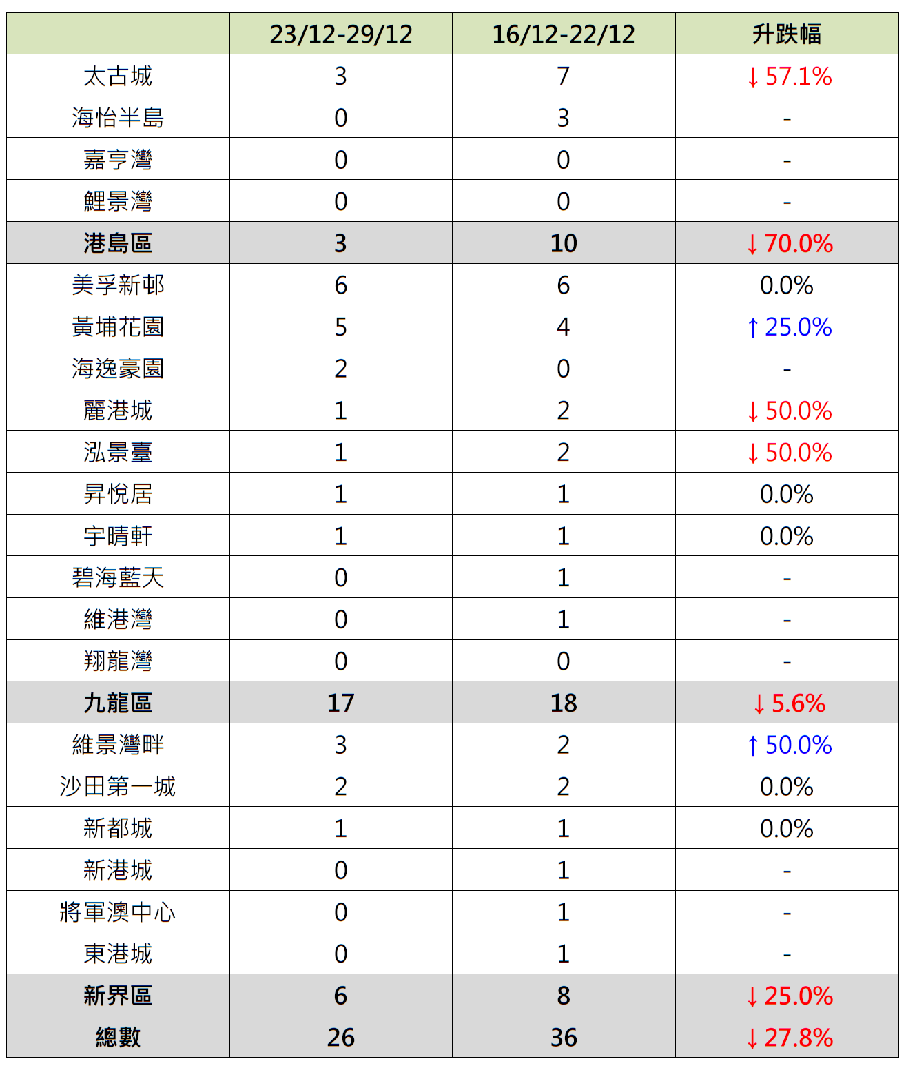 据本行前线分行所录得的数字显示,综合过去一星期(12月23日至12月29日)全港20大主要屋苑二手买卖录26宗成交,较前周(12月16日至12月22日)的36宗减少约27.8%,连跌2周(见图)。