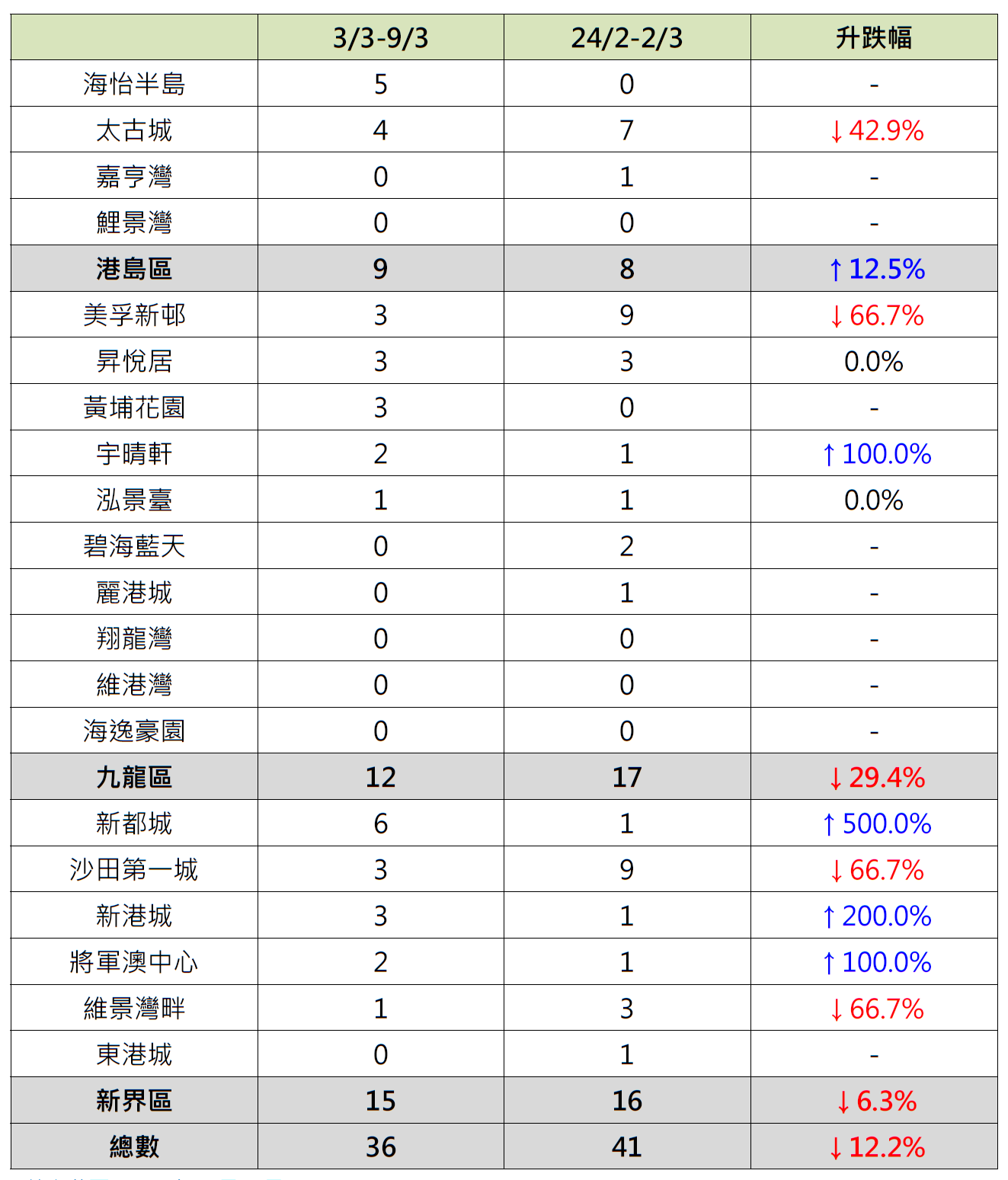 反观,港岛区4个指标屋苑上周录9宗成交,较前周的8宗增加逾12%;当中海怡半岛“破蛋”,按周增加5宗成交;相反,太古城录4宗成交,较前周的7宗减少约42.9%;嘉亨湾由前周录1宗成交减少至上周“零成交”。
