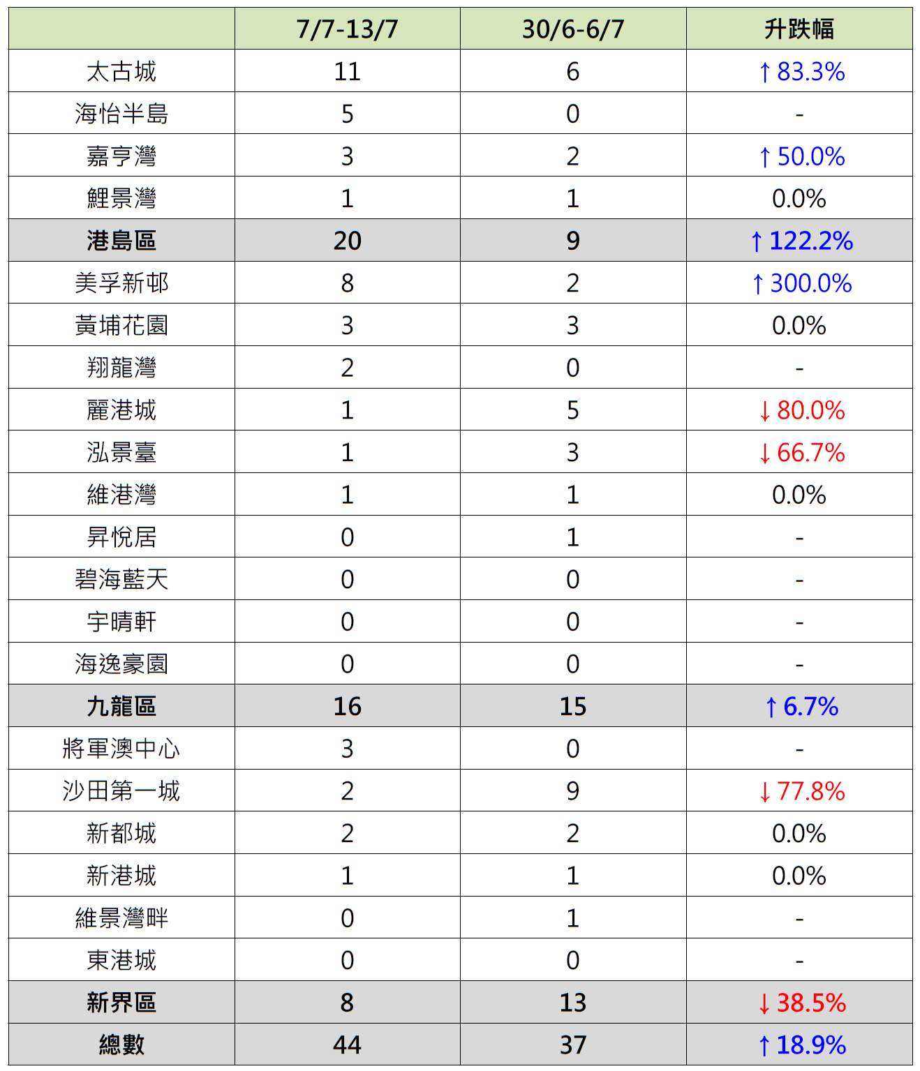 港岛区4个指标屋苑上周录20宗成交,较前周的9宗更大增逾1.2倍;当中嘉亨湾录3宗成交,较前周的2宗增加50%;太古城录11宗成交,较前周的6宗增加约83.3%;海怡半岛“破蛋”,按周增加5宗成交。