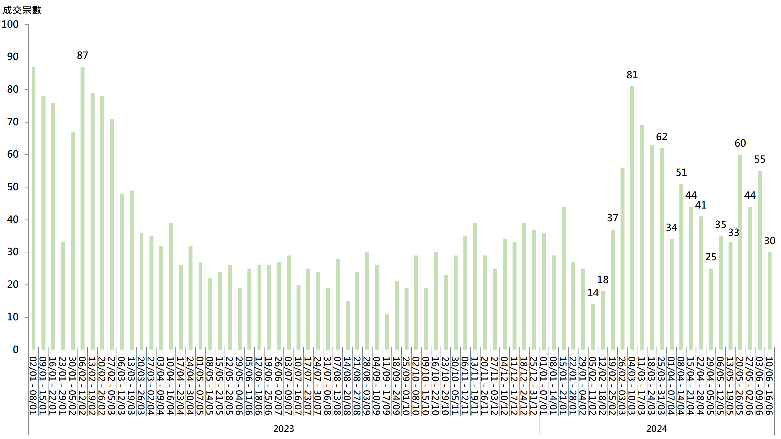 图︰20大屋苑每周二手买卖成交宗数走势