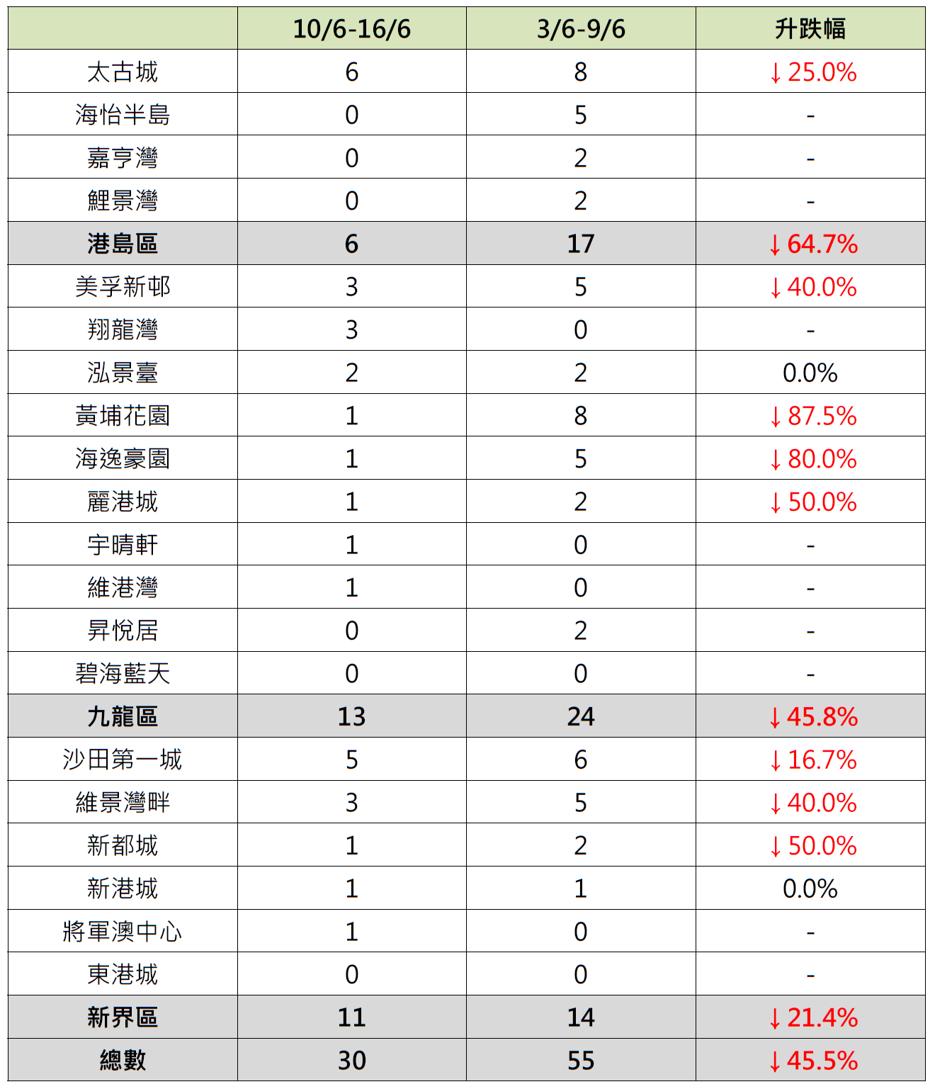 观乎上周,港岛、九龙及新界三区屋苑二手交投按周表现全线下跌,其中港岛区4个指标屋苑上周录6宗成交,较前周的17宗减少约64.7%;当中太古城录6宗成交,较前周的8宗减少25%;嘉亨湾及鲤景湾齐由前周录2宗成交减少至上周“零成交”;海怡半岛更由前周录5宗成交减少至上周“零成交”。
