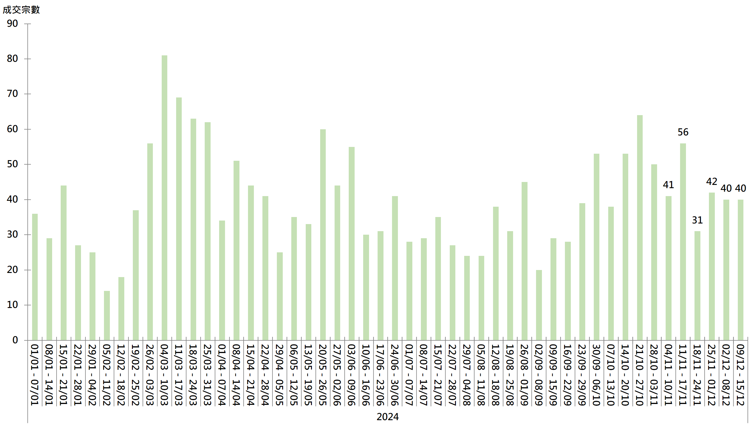 据本行前线分行所录得的数字显示,综合过去一星期(12月9日至12月15日)全港20大主要屋苑二手买卖录40宗成交,按周持平;成交量已连续3周企稳40宗水平(见图)。