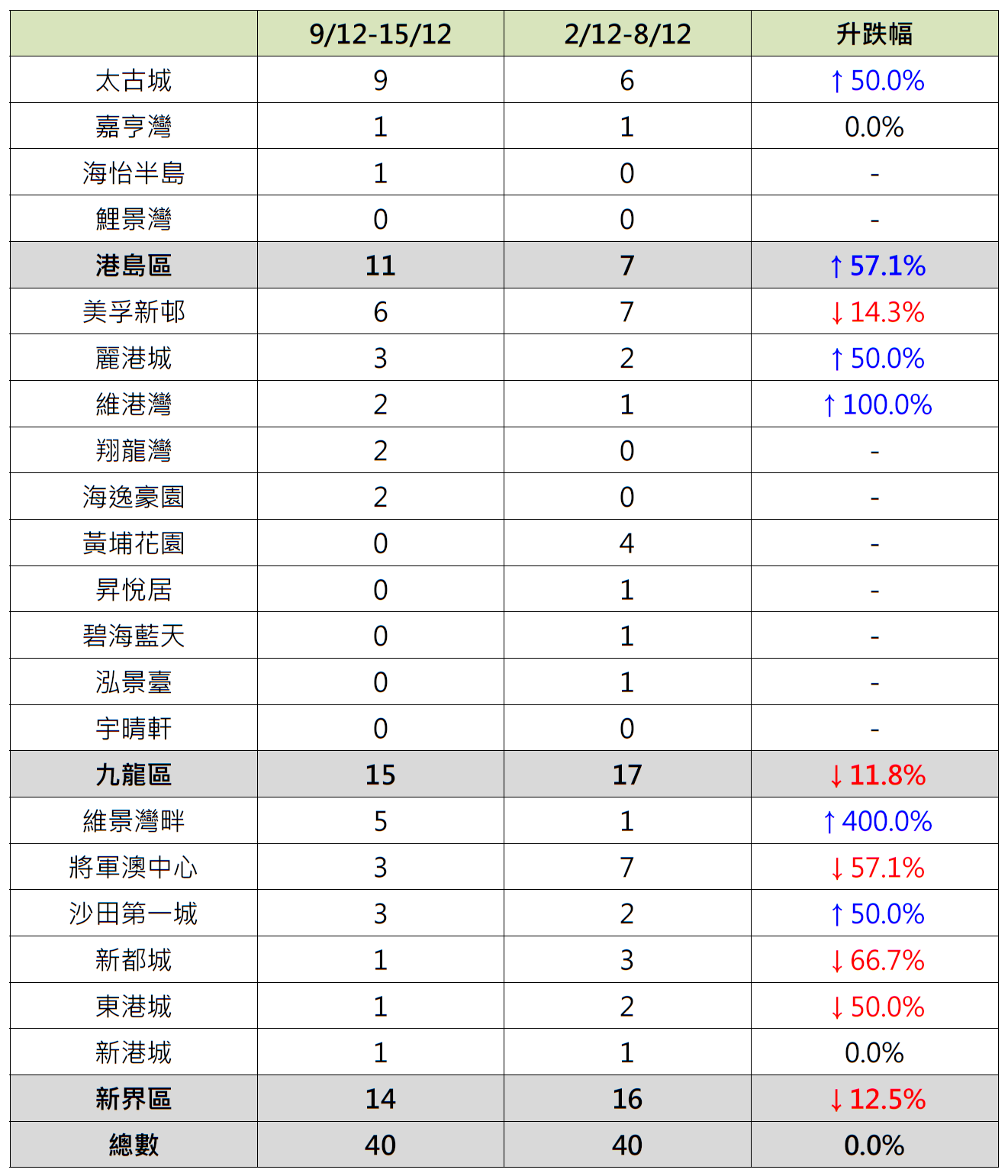 反观,九龙区10个指标屋苑上周录15宗成交,较前周的17宗减少约11.8%;当中美孚新邨录6宗成交,较前周的7宗减少约14.3%;升悦居、碧海蓝天及泓景台齐由前周录1宗成交减少至上周“零成交”;黄埔花园更由前周录4宗成交减少至上周“零成交”;相反,丽港城录3宗成交,较前周的2宗增加50%;维港湾录2宗成交,较前周的1宗增加1倍;翔龙湾及海逸豪园更齐“破蛋”,按周同样增加2宗成交。