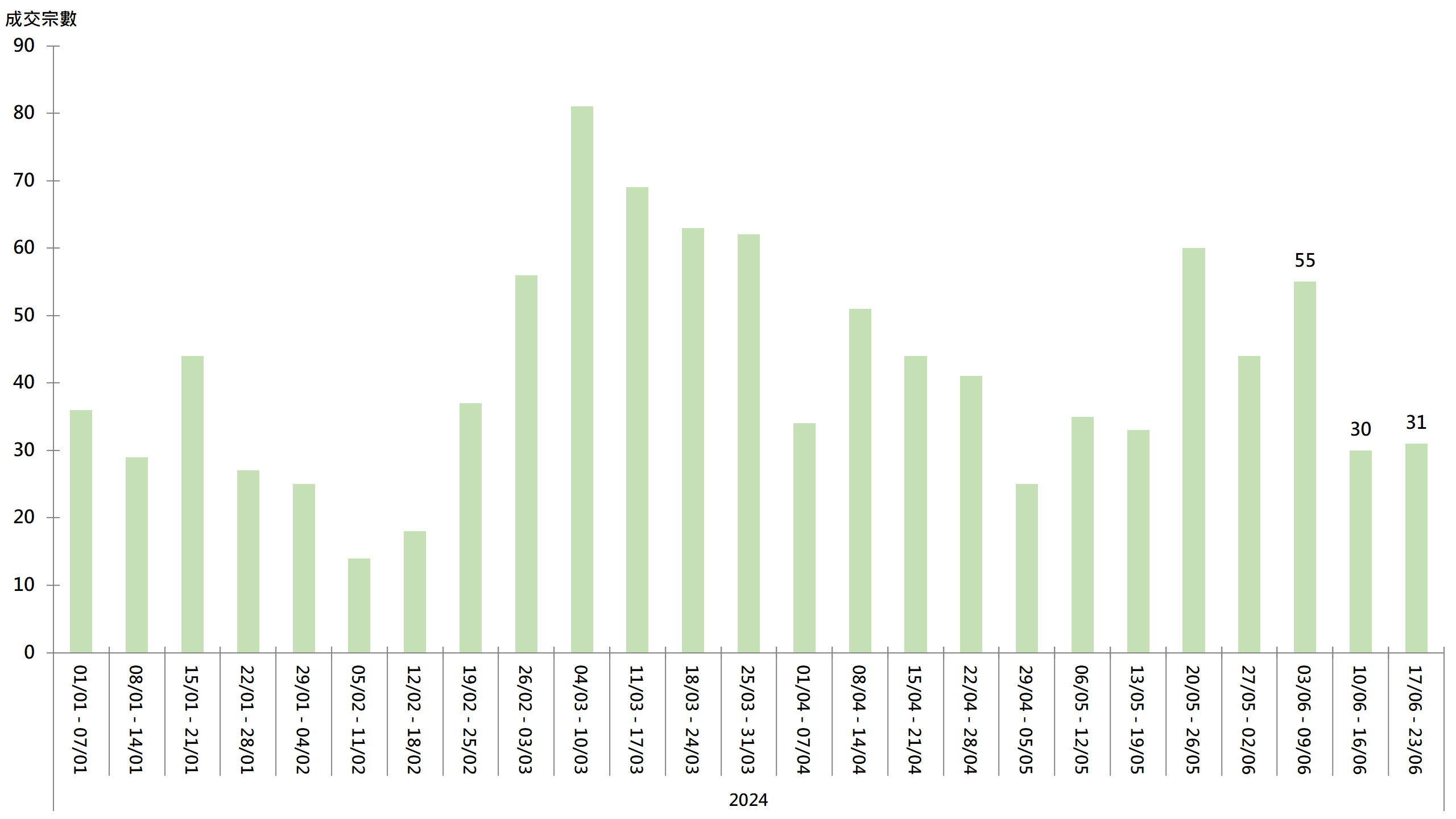 图︰20大屋苑每周二手买卖成交宗数走势