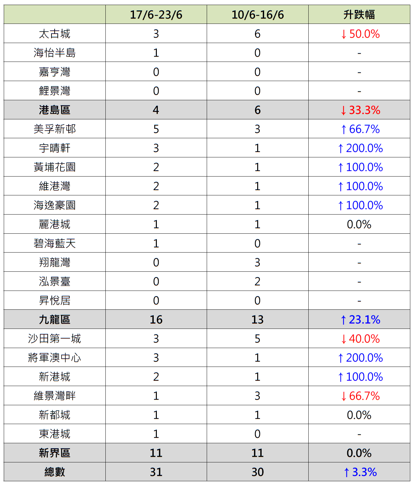 新界区6个指标屋苑上周录11宗成交,按周持平;当中新港城录2宗成交,较前周的1宗增加1倍;将军澳中心录3宗成交,较前周的1宗增加2倍;东港城“破蛋”,按周增加1宗成交;相反,沙田第一城录3宗成交,较前周的5宗减少40%;维景湾畔录1宗成交,较前周的3宗减少约66.7%。