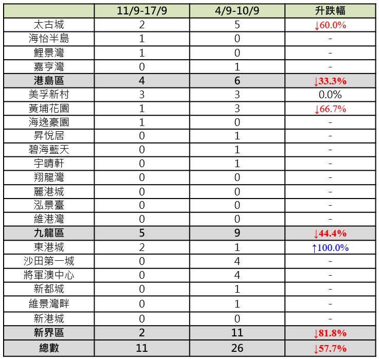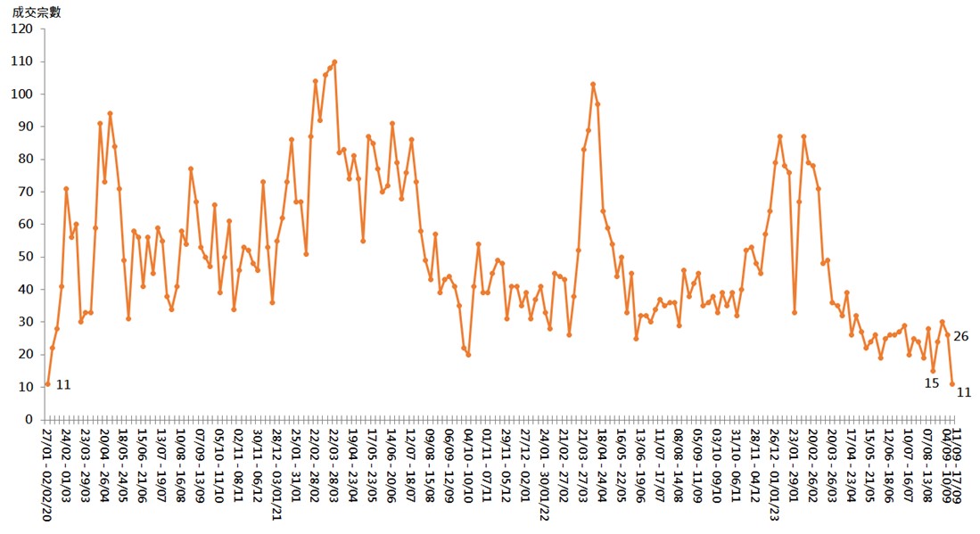 美国将于本周四公布议息结果,准买家入市态度审慎,二手交投疲弱;据本行前线分行所录得的数字显示,综合过去一星期(9月11日至9月17日)全港20大主要屋苑二手买卖录11宗成交,较前周(9月4日至9月10日)的26宗减少约57.7%,创逾3年半新低(见图)。