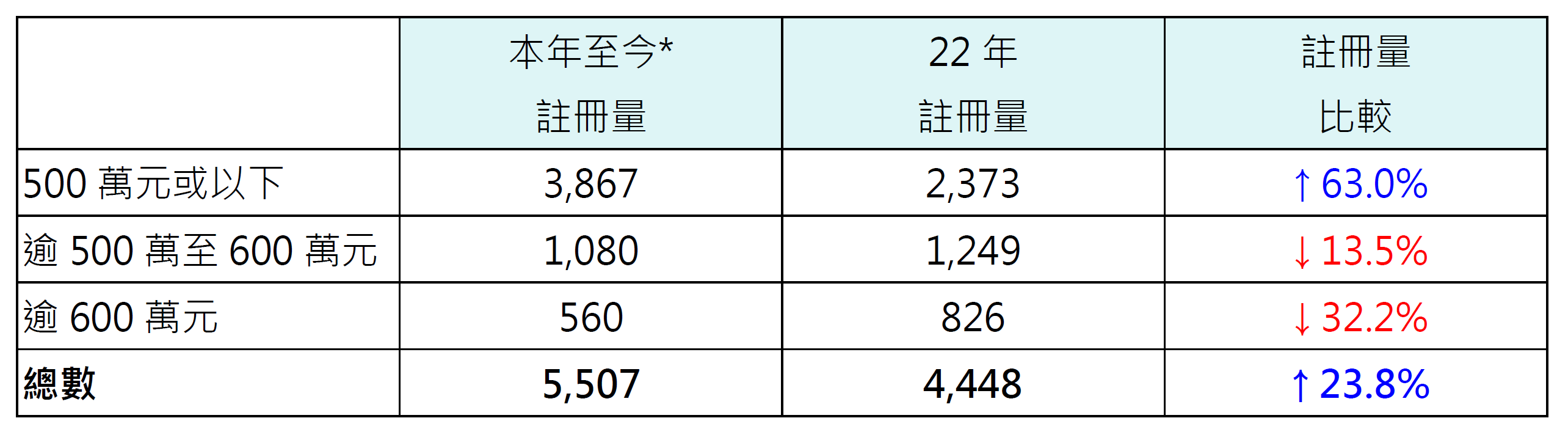 若以金额划分本年至今二手居屋注册量表现,其中500万元或以下二手居屋录3,867宗注册,较去年的2,373宗增加约63%;相反,逾500万至600万元二手居屋录1,080宗注册,较去年的1,249宗减少约13.5%;逾600万元二手居屋录560宗注册,较去年的826宗减少约32.2%(见表一)。