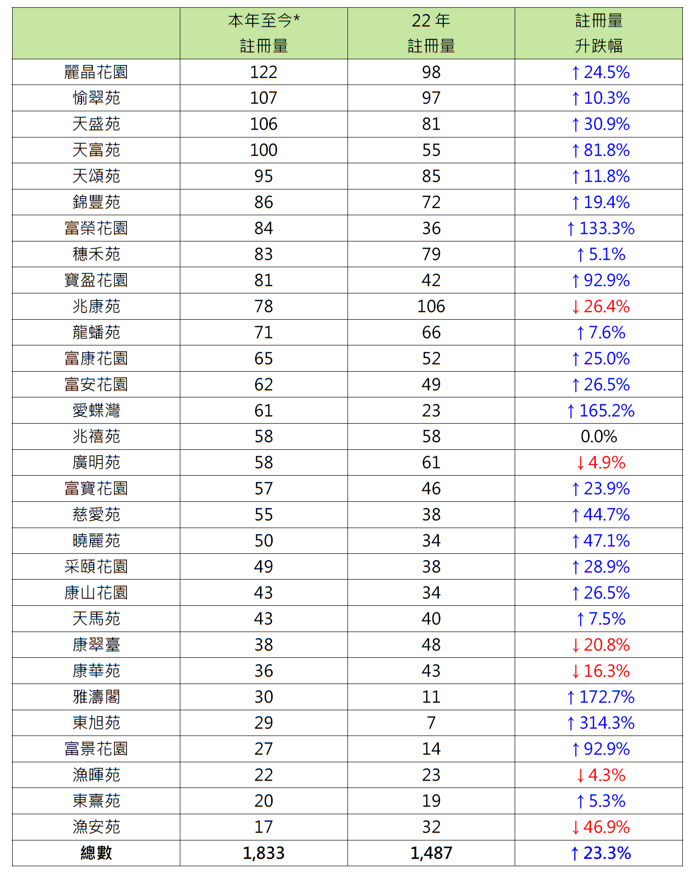 注册量按年报升的屋苑中,筲箕湾东旭苑录29宗注册,较去年的7宗增加逾3.1倍;黄竹坑雅涛阁录30宗注册,较去年的11宗增加逾1.7倍;筲箕湾爱蝶湾录61宗注册,较去年的23宗增加逾1.6倍。