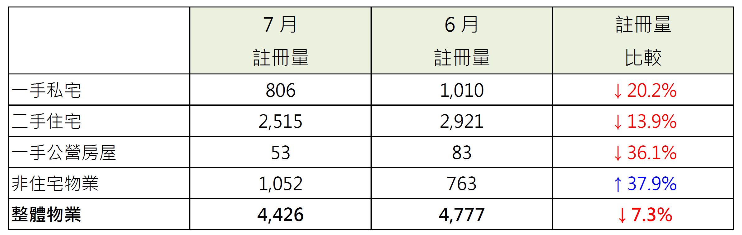 据土地注册处资料显示,7月整体物业(包括一手私宅及二手住宅、一手公营房屋、工商舖、纯车位及其他非住宅)录4,426宗注册,较6月的4,777宗减少约7.3%,连跌4个月,创今年新低。鉴于签署买卖合约至递交到土地注册处注册登记需时,7月注册个案一般主要反映6月市况。