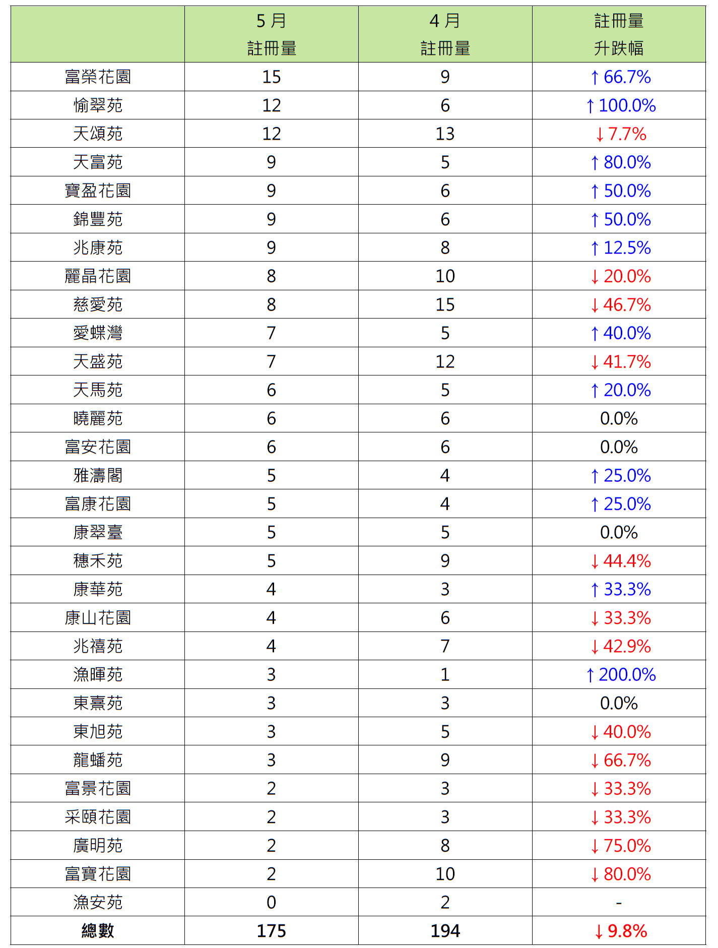 报升屋苑中,香港仔渔晖苑录3宗注册,较4月的1宗增加2倍;沙田愉翠苑录12宗注册,较4月的6宗增加1倍;天水围天富苑录9宗注册,较4月的5宗增加80%。