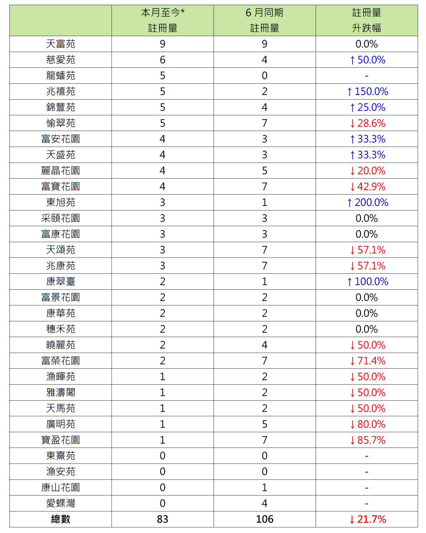 报跌屋苑中,将军澳宝盈花园及将军澳广明苑各录得1宗注册,分别较6月同期的7宗及5宗减少约85.7%及80%;旺角富荣花园录2宗注册,较6月同期的7宗减少约71.4%。