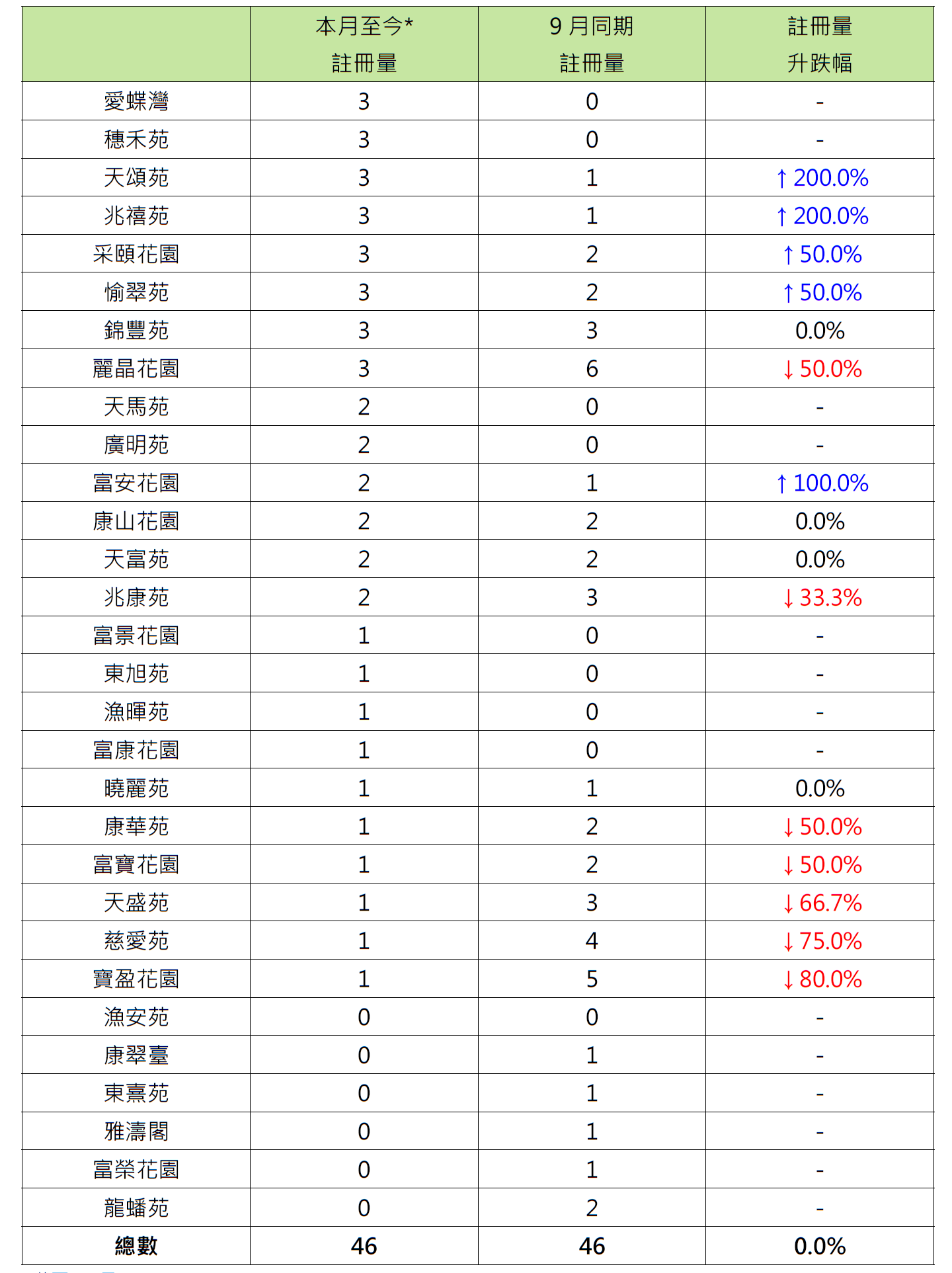 报升屋苑中,新蒲岗采颐花园及沙田愉翠苑各录得3宗注册,同样较上月同期的2宗增加50%;马鞍山富安花园录2宗注册,较上月同期的1宗增加1倍。