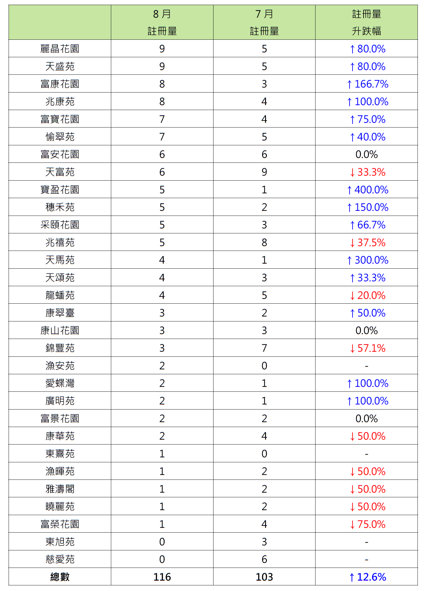 报升屋苑中,将军澳宝盈花园录5宗注册,较7月的1宗大增4倍;黄大仙天马苑录4宗注册,较7月的1宗大增3倍;将军澳富康花园录8宗注册,较7月的3宗大增逾1.6倍。