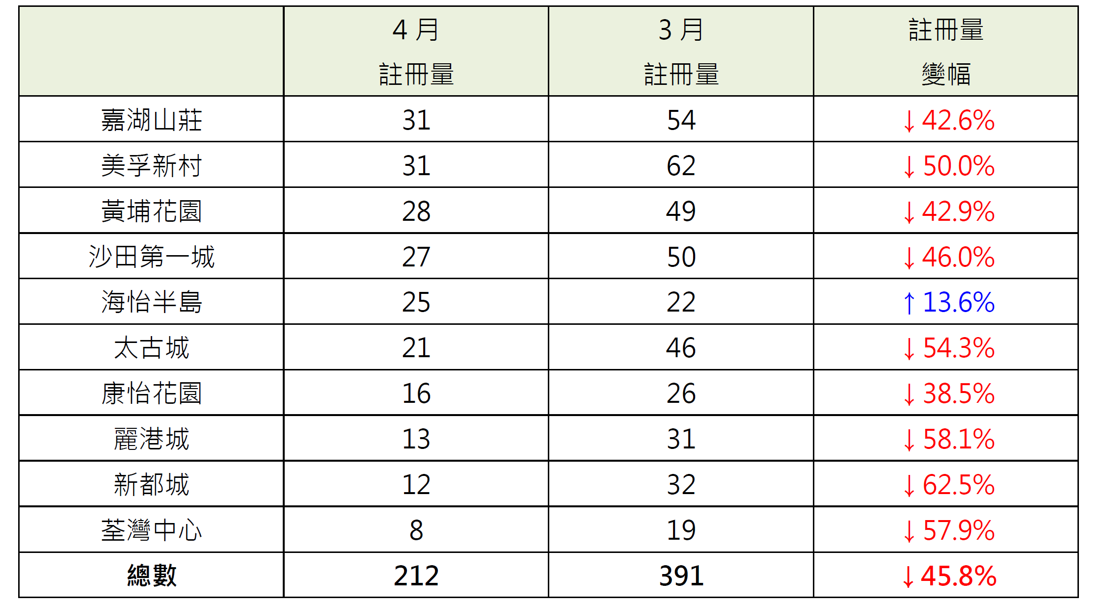 据土地注册处资料显示,十大传统屋苑4月录212宗注册,较3月的391宗减少约45.8%,创4个月新低(见图)。鉴于签署买卖合约至递交到土地注册处注册登记需时,4月注册个案一般主要反映3月市况。