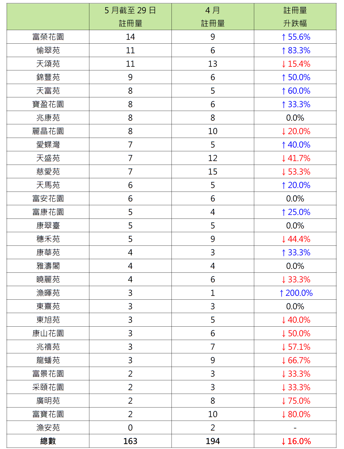 报升屋苑中,香港仔渔晖苑录3宗注册,较4月的1宗增加2倍;沙田愉翠苑录11宗注册,较4月的6宗增加约83.3%;天水围天富苑录8宗注册,较4月的5宗增加60%。