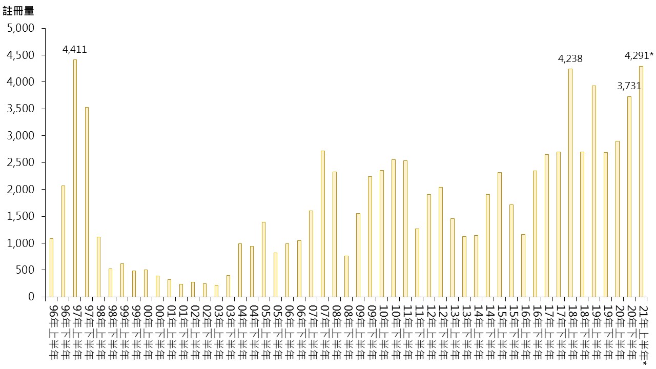 据土地注册处资料显示,上半年至今(截至5月26日)录26,370宗二手住宅注册,已较去年下半年的24,804宗高出约6.3%,而当中逾1,000万元二手住宅上半年至今录4,291宗注册,更较去年下半年的3,731宗高出约15%,亦创自97年上半年后新高;若计及今年6月,料整个上半年逾1,000万元二手住宅注册量势创有纪录新高(见图)。